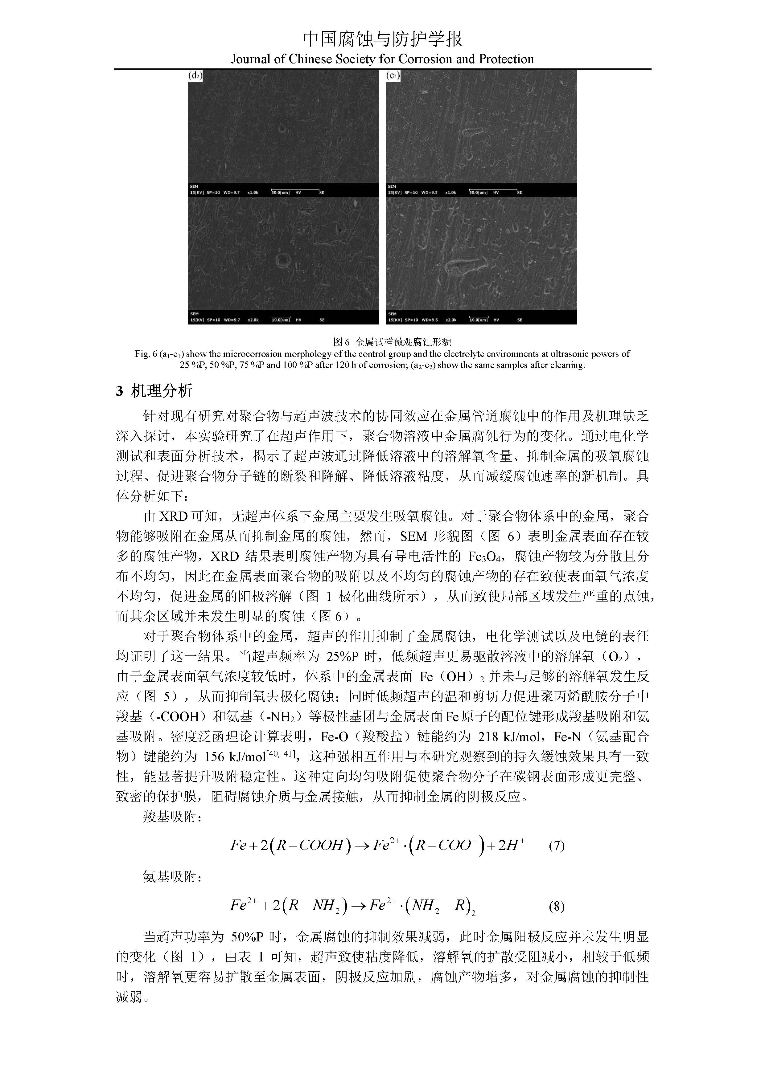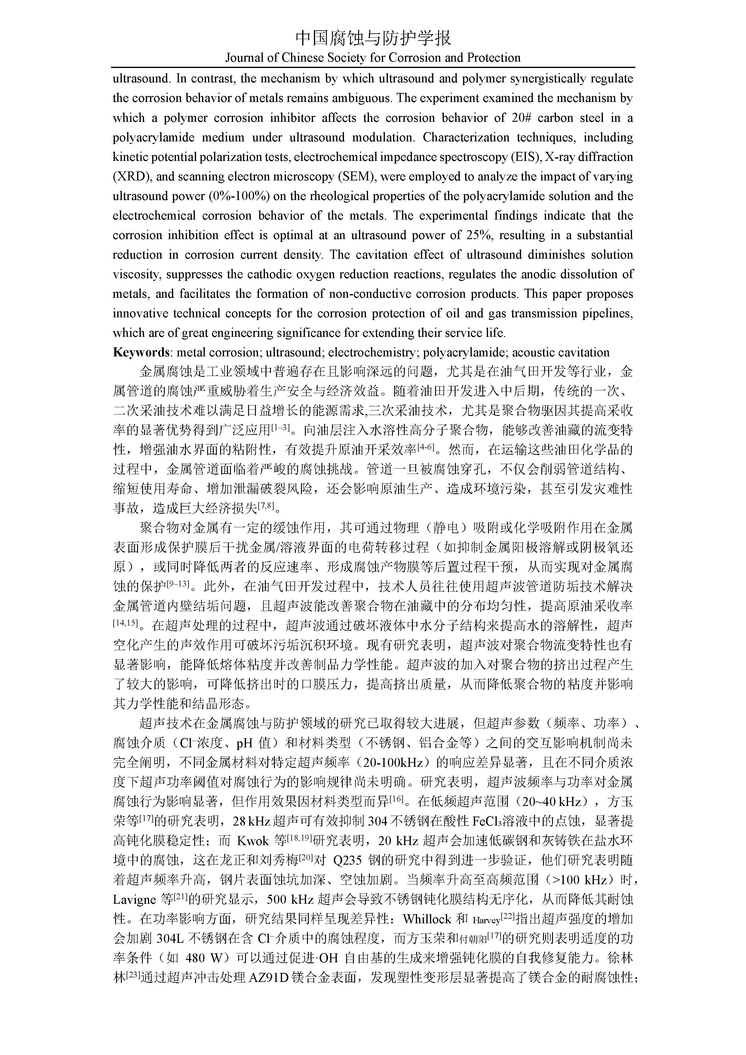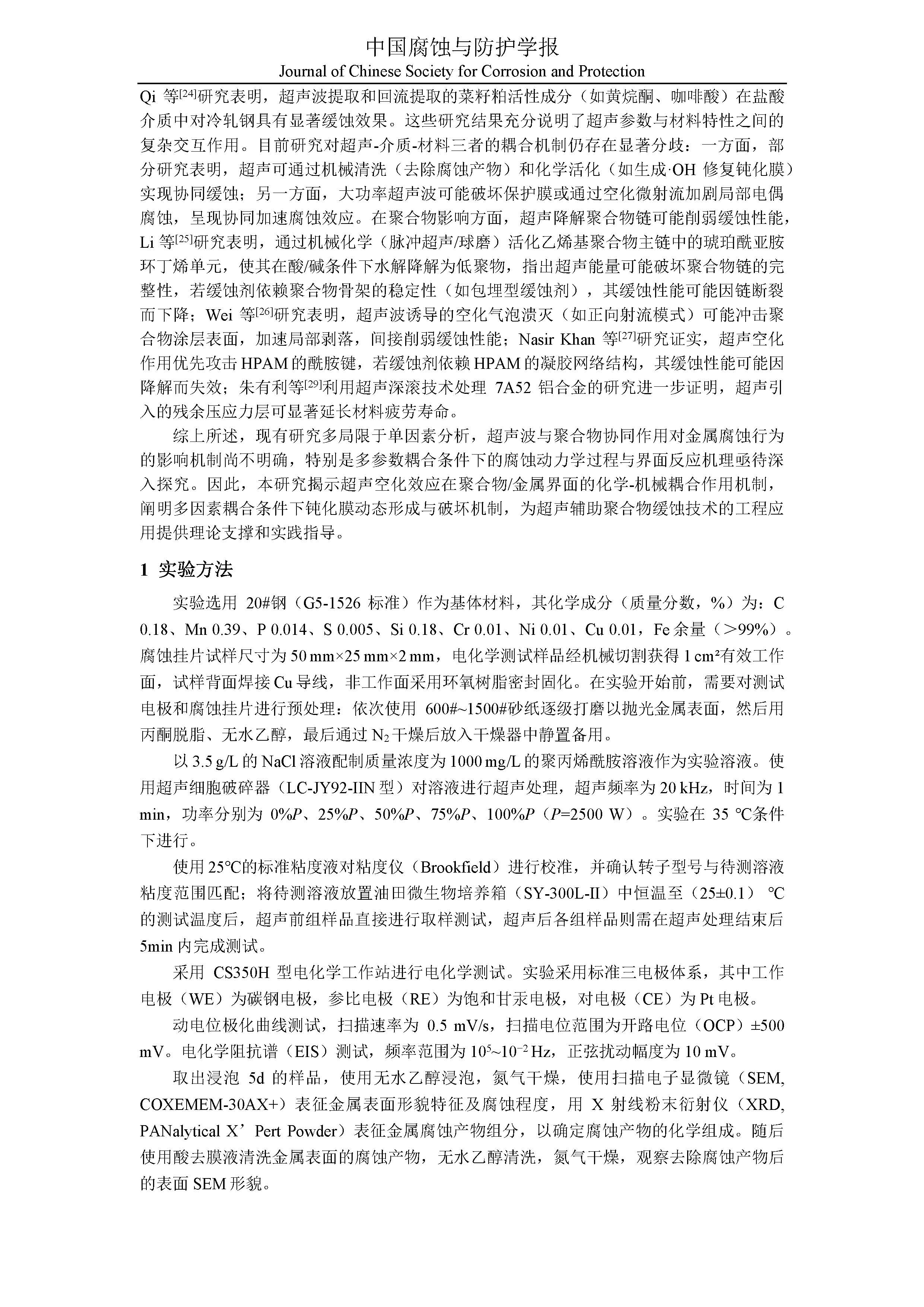 超声波调控下聚合物缓蚀剂对金属腐蚀行为的作用机制研究.