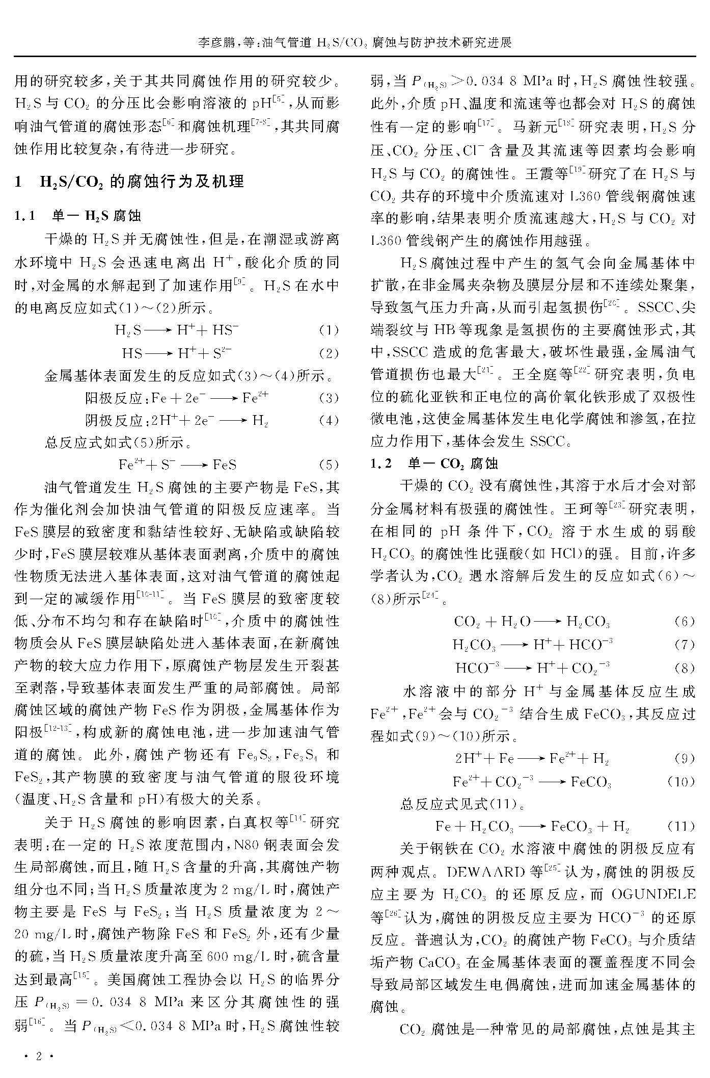 油气管道H2S/CO2 腐蚀与防护技术研究进展
