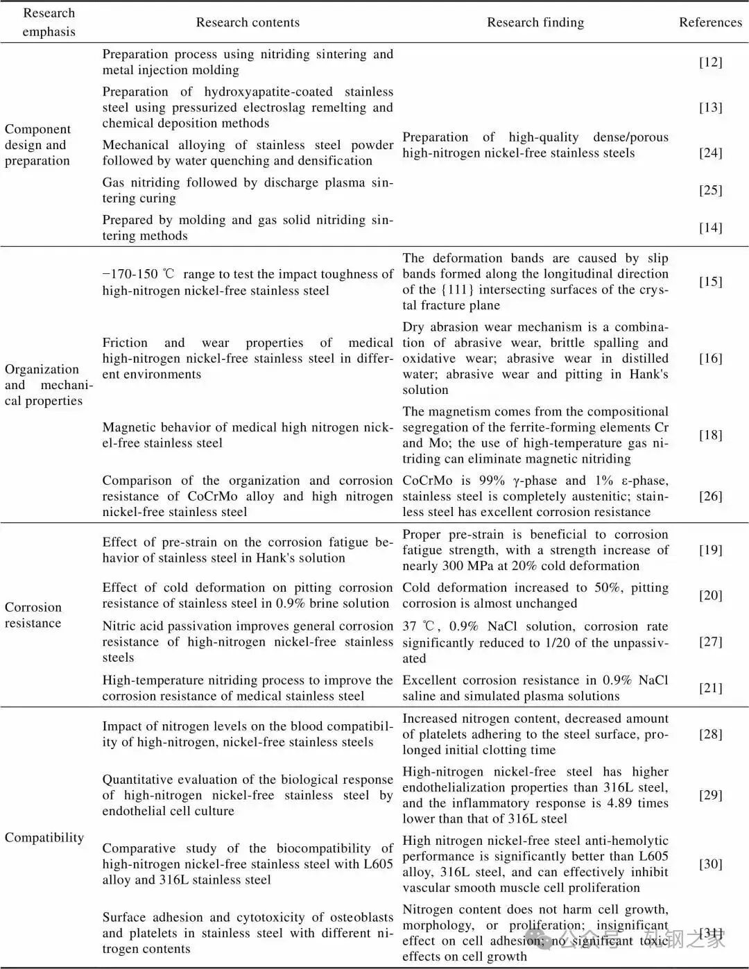 为解决上述问题,近年来,国内外学者对高氮无镍不锈钢开展了广泛而深入的系统研究,并取得系列研究成果,主要包括: