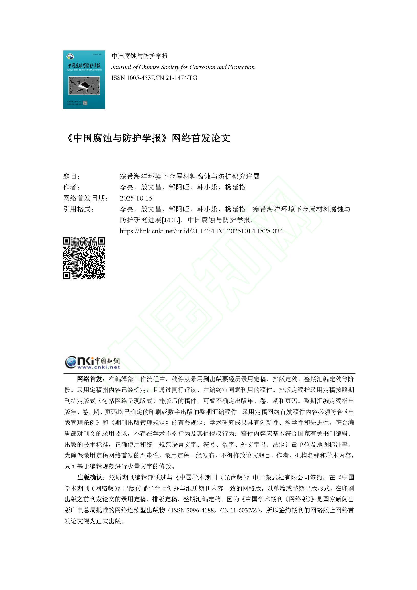 来源:中国腐蚀与防护学报