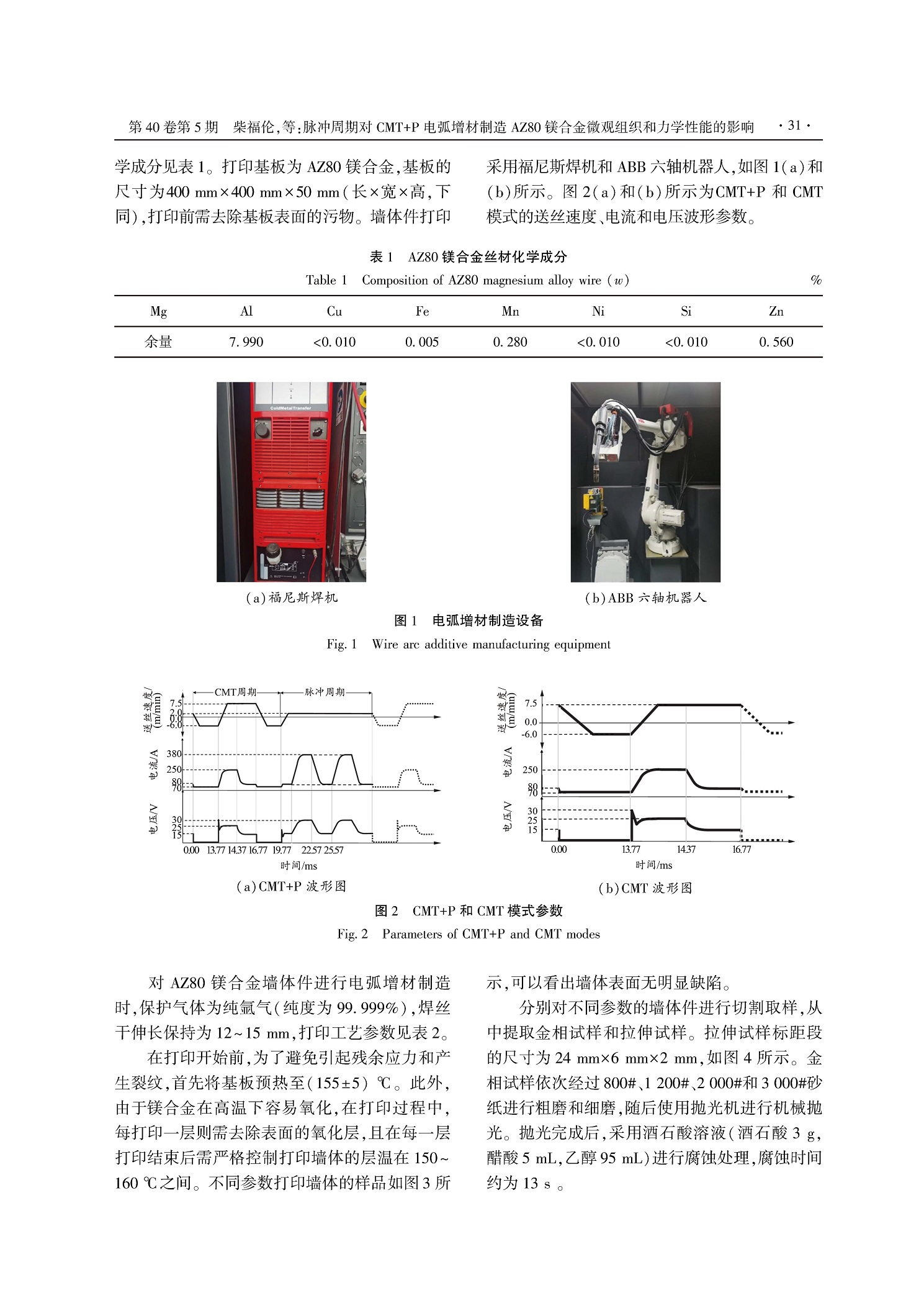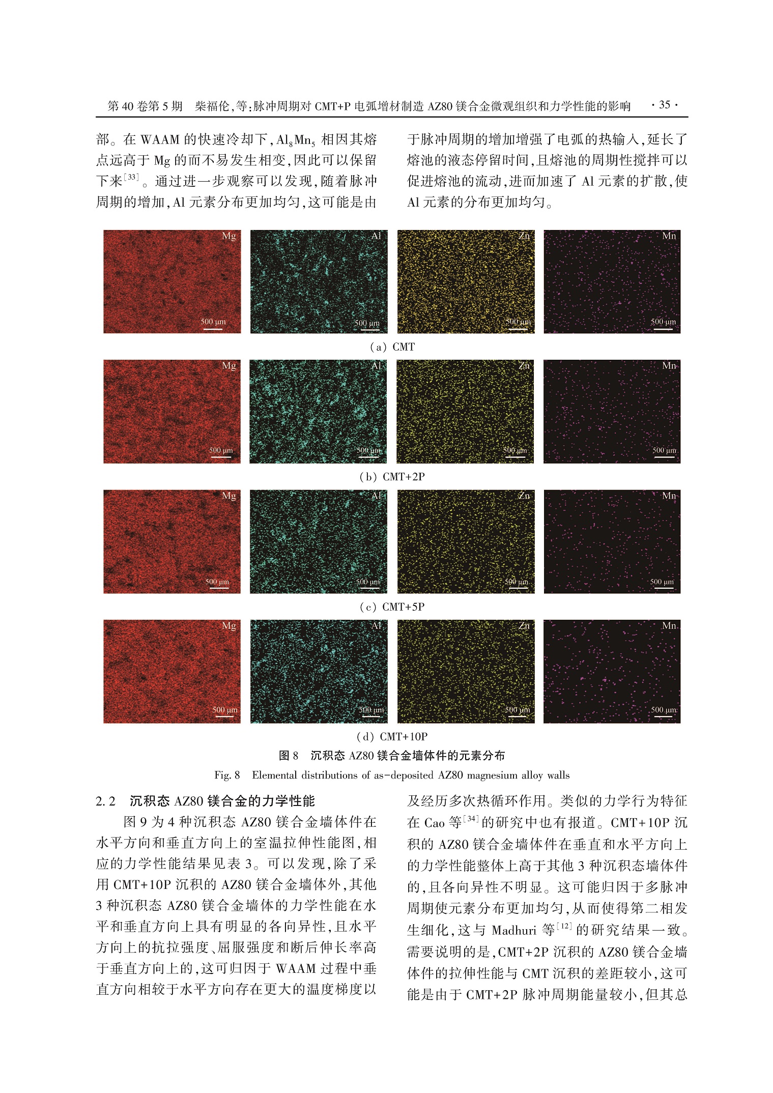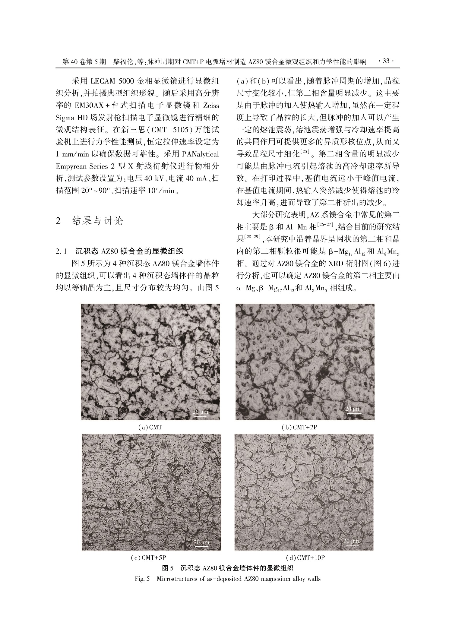 脉冲周期对CMT+P电弧增材制造AZ80镁合金微观组织和力学性能的影响