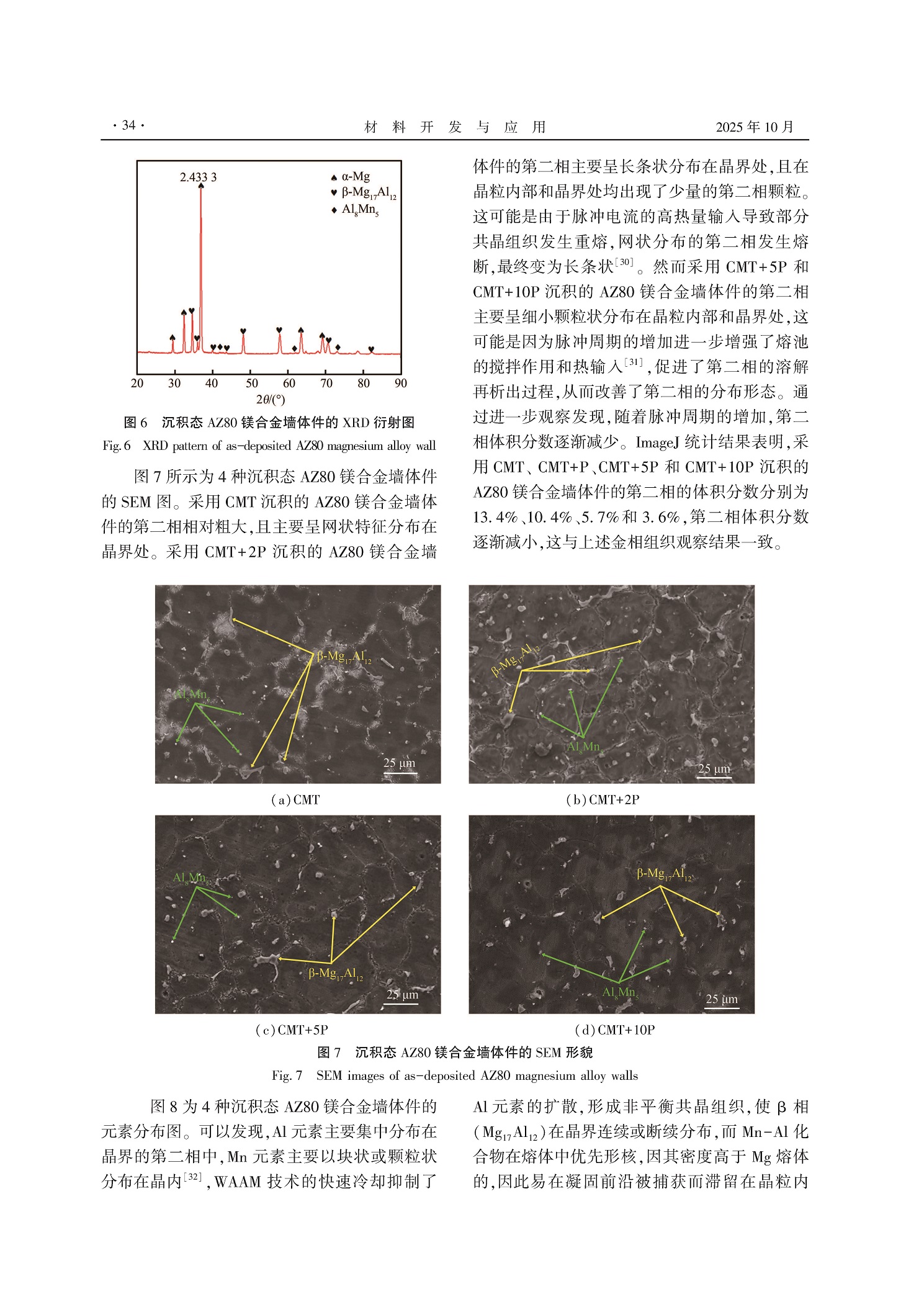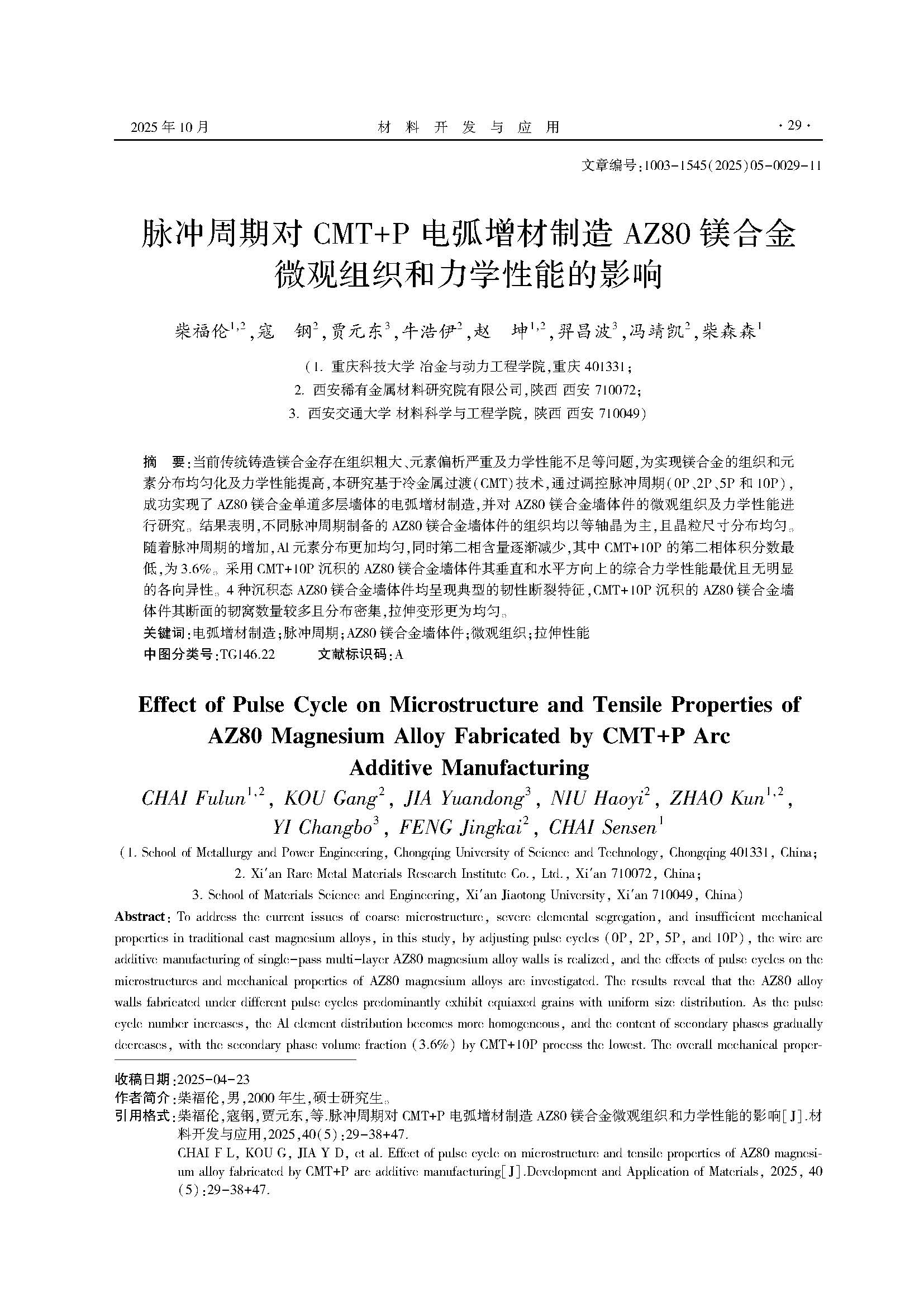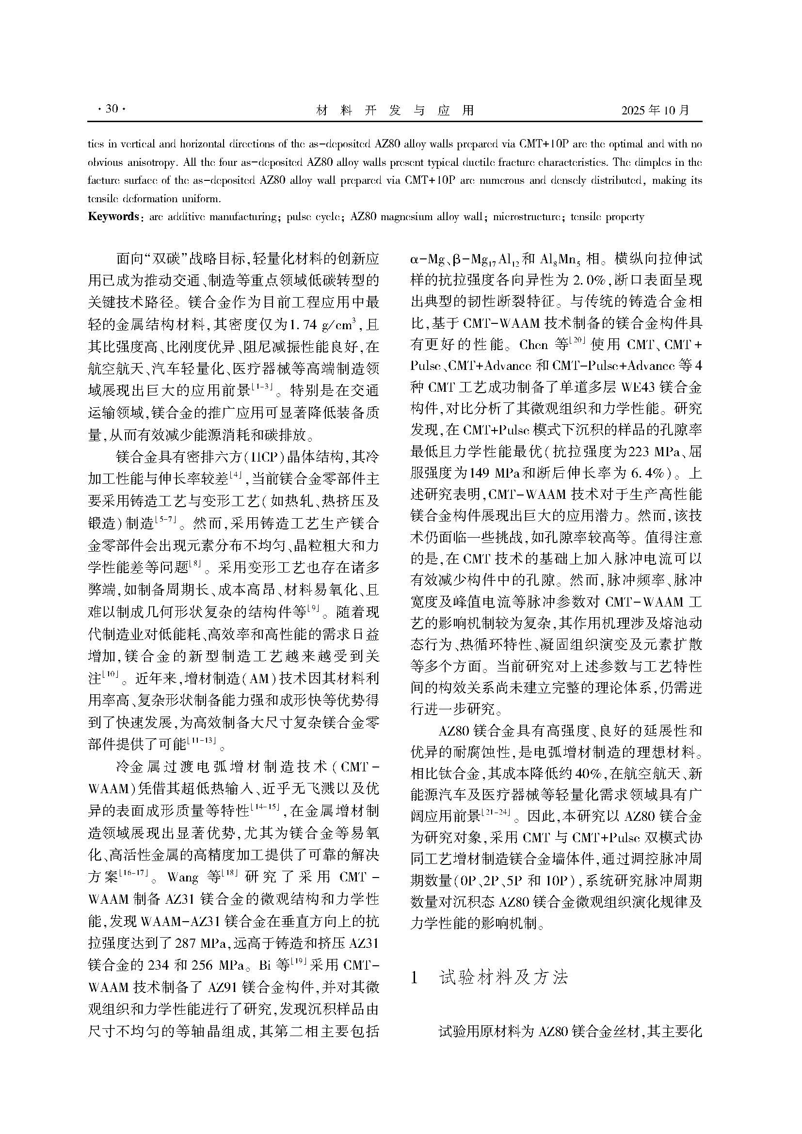 脉冲周期对CMT+P电弧增材制造AZ80镁合金微观组织和力学性能的影响