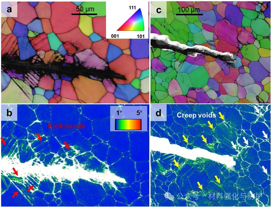 室温下应变在晶粒内部均匀分布,350°C时应变向晶界局部化,450-600°C晶界应变局部化加剧,晶粒内部应变降低,变形机制从晶粒内位错滑移转向晶界滑动与应力集中。25-350°C低温时裂纹单源萌生,扩展以穿晶为主,350°C时晶粒内扭折带可分散裂纹尖端应力,延缓扩展。600°C高温下多源裂纹萌生,扩展为穿晶与晶间混合模式,晶界出现蠕变孔洞,应变在三重晶界显著局部化,加速裂纹萌生与扩展。