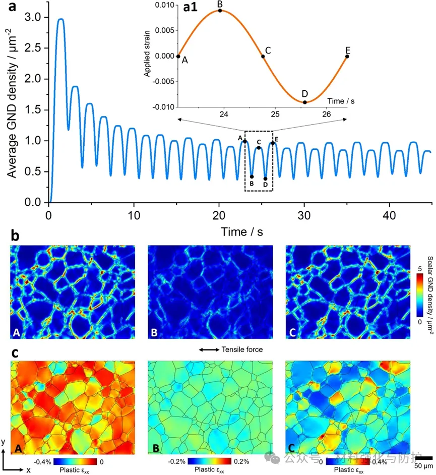 蠕变损伤对总SED的贡献随温度升高而增加,450°C时约5.3%,600°C失效时达11%。另外,蠕变损伤显著加剧循环软化,降低局部滑移阻力、减小弹性模量,且放大应变局部化,与实验观察一致。600°C每循环内,GND密度在卸载状态达最大,峰值/谷值载荷时最小。蠕变损伤可减小循环内GND密度波动,且GND在晶界集中,与 EBSD 实验结果吻合。