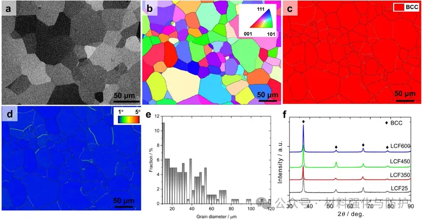 HfNbTiZr RHEA经冷轧和退火后,形成平均晶粒尺寸约35μm的均匀等轴晶结构,无宏观缺陷,且在25-600°C范围内保温超1h后保持单相BCC结构,无残余应力。