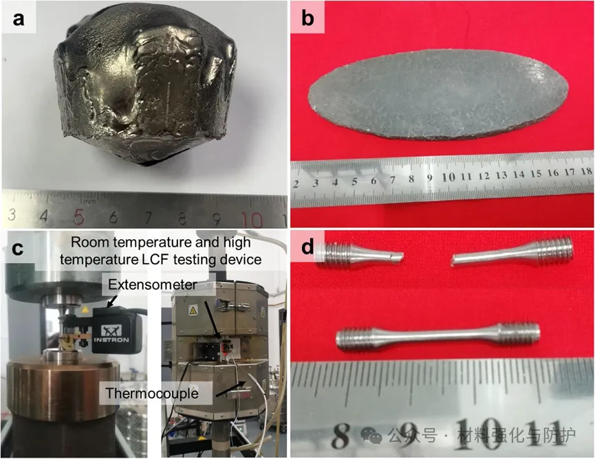 (a) HfNbTiZr耐火高熵合金铸造试样,(b)冷轧后的RHEA试样,厚度为7 mm,(c) LCF试验原理图,(d) LCF测试前后的RHEA试件,直径为3mm的漏斗状棒试件