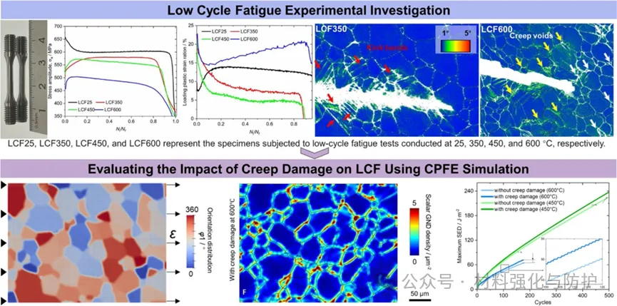 该研究以HfNbTiZr难熔高熵合金(RHEA)为对象,通过实验分析和基于位错的损伤耦合晶体塑性有限元(CPFE)模拟结合,系统探究了蠕变损伤对其高温低周疲劳(LCF)行为的影响,发现合金LCF寿命随温度升高显著降低,25-350°C的损伤机制为穿晶疲劳损伤,450-600°C下转变为晶间疲劳与蠕变损伤双机制,600°C时蠕变损伤显著促进几何必需位错(GND)积累、晶界裂纹萌生扩展及循环软化,且通过CPFE模拟量化得出蠕变损伤对总储存能量密度的贡献随温度升高而增加,600°C时占比达11%,为该类合金高温应用提供关键机制解析与理论指导。