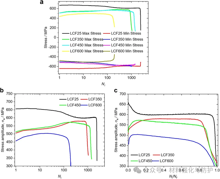 LCF寿命随温度升高显著降低,高温下蠕变损伤加速失效。室温(25°C)下应力振幅在初始100循环内快速下降,随后长期稳定,表现为循环软化,变形机制以晶粒内部均匀位错滑移为主。350-600°C高温下循环硬化,应力振幅先升高,后稳定或逐渐下降。