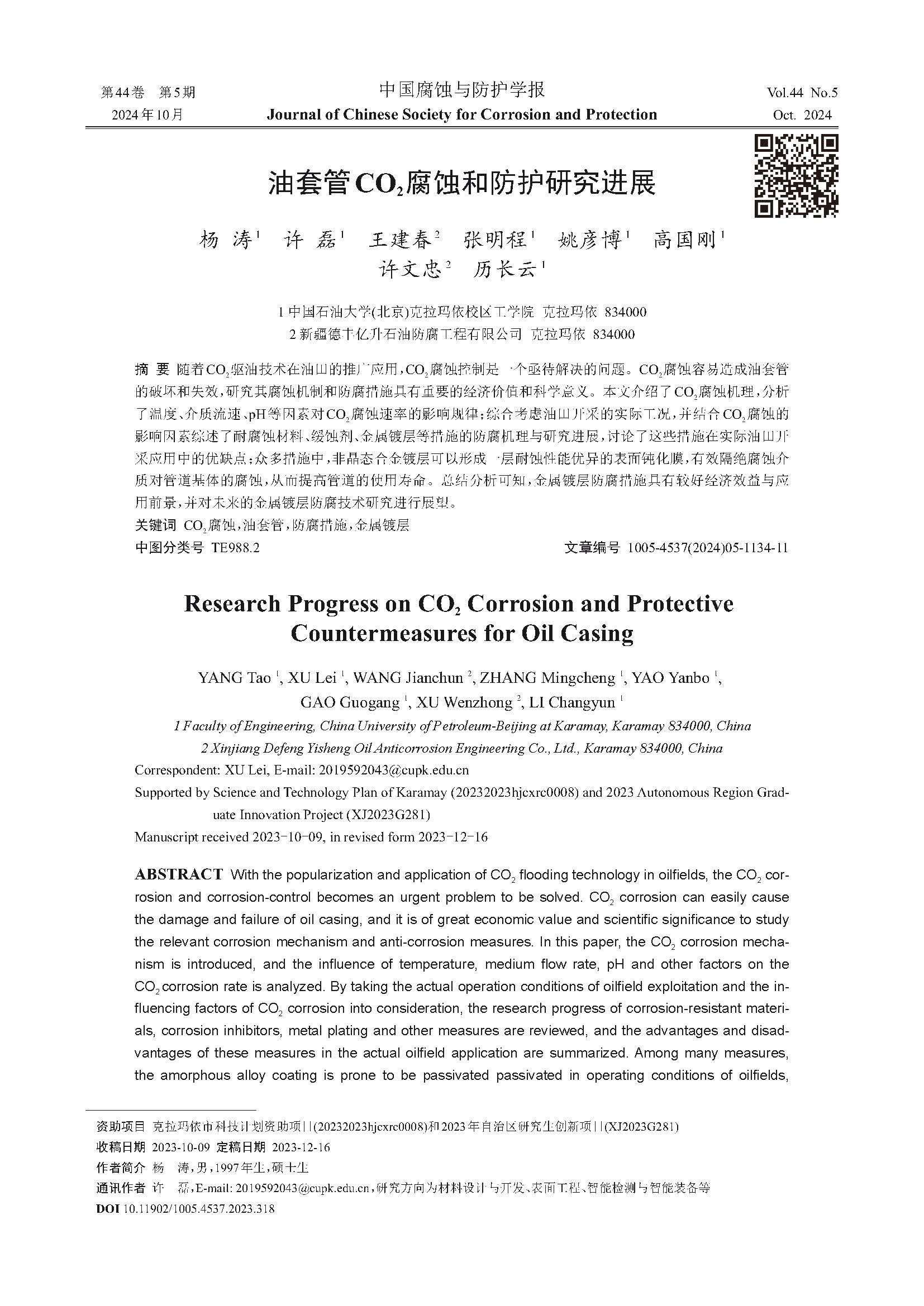 来源:中国腐蚀与防护学报
