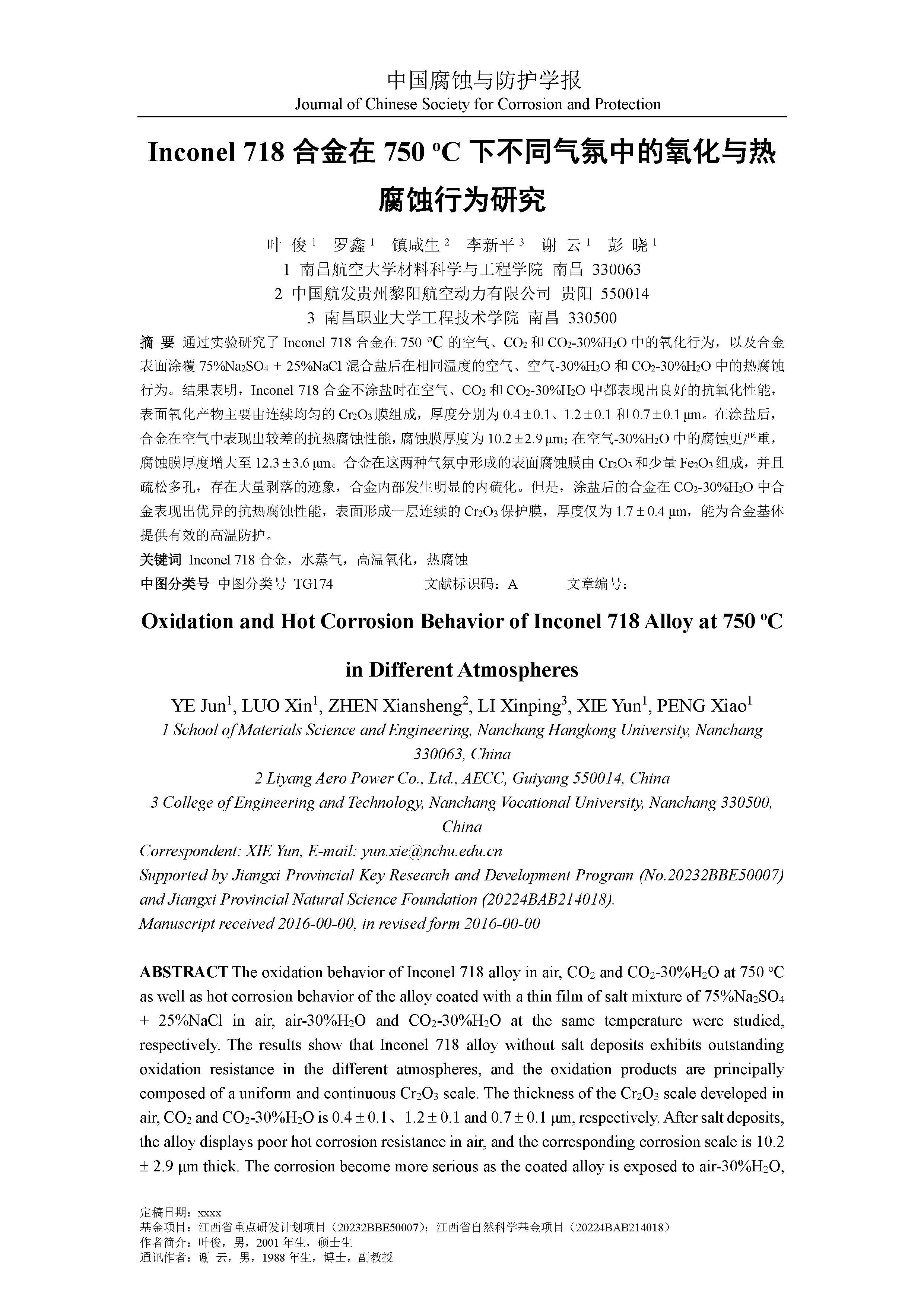 Inconel 718 合金在 750 oC 下不同气氛中的氧化与热腐蚀行为研究