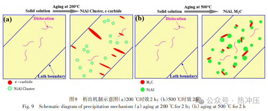 818钢采用真空感应→真空自耗→锻造(锻比≥12)→热处理工艺流程,以3N级高纯铁为原料。其名义成分(质量分数)%为0.32C-2.0Si-1.1Mn-0.6Cr-2.2Ni-0.3Mo-0.4V,杂质元素严格控制:S、P、O、N、H总量82×10-6,As、Sn、Sb、Bi、Pb总量130×10-6。 团队开发的“深冷处理+二次淬火”工艺通过先消除后重新生成残余奥氏体(RA)的策略,获得了细小弥散的RA组织,如图5所示,显著提升了其稳定性与分布均匀性。在RA含量相近条件下,该工艺使冲击功较传统处理提升15%,最终获得抗拉强度1 909 MPa、屈服强度1 432 MPa、伸长率12%、V型冲击功50.8 J的优异综合性能[49-50]。 819钢采用真空感应→真空自耗→锻造(锻比≥13.5)→热处理工艺流程,以3N5级高纯铁为原料。其名义成分(质量分数)%为0.35C-1.62Si-0.86Mn-1.62Cr-3Ni-0.45Mo-0.22V,杂质元素严格控制:S、P、O、N、H总量45×10-6,As、Sn、Sb、Bi、Pb总量23×10-6,较818钢降低。 经980℃淬火+280℃回火后,819钢形成由板条马氏体、残余奥氏体与ε-碳化物组成的复合组织,如图6所示。其优异的强韧性源于协同作用机制:高位错密度板条马氏体与弥散ε-碳化物提供强化效应,板条亚结构与薄膜状残余奥氏体提供韧化贡献。最终获得抗拉强度2 013 MPa、均匀伸长率11%、夏比U型冲击功67.2 J的综合性能[51]。 821钢采用真空感应→真空自耗→锻造(锻比≥12)→热处理工艺流程,以3N级高纯铁为原料。其名义成分(质量分数)%为0.31C-2Si-1Mn-1Cr-5Ni-0.6Mo-0.1V-1.3Al,杂质元素S、P、O、N、H总量89×10-6。 经970℃淬火+180℃低温回火后,821钢组织由板条马氏体、残余奥氏体、ε-碳化物及高数密度纳米级NiAl团簇构成,如图7所示。均匀分布的NiAl纳米团簇可优化位错分布、减轻界面位错塞积,有效延缓微裂纹萌生,赋予材料卓越的强韧性:抗拉强度1 894 MPa、均匀伸长率接近15%、U型缺口冲击功83 J、断裂韧性高达108 MPa·m1/2[49]。 3.2高合金超高强钢 本研究通过在二次硬化钢中引入NiAl相(与Co协同),将M2C碳化物数量密度提升至1024 m-3。NiAl相与M2C碳化物相互抑制粗化的机制为开发高性能钢种奠定了基础。据此研制的2112钢(0.20C-12Co-13.5Ni-1Al-1.3Cr-1.3Mo-0.6 W)和A800钢(0.26C-13.5Co-14.2Ni-1.2Al-2.1Cr-1.8Mo-0.6 W)(质量分数)%均表现出优异性能。 2112钢采用真空感应→真空自耗→锻造开坯→轧制→热处理工艺流程,以3N级高纯铁为原料,其强韧性匹配如图8所示。 时效温度对2112钢的组织和性能具有显著影响。200℃时效时,马氏体基体中析出亚微米级ε-碳化物和高数密度纳米级NiAl团簇,两者独立形核;高数密度NiAl团簇通过缓解位错塞积,使冲击功达到136 J。500℃时效时,析出相演变为数密度达9.3×1023 m-3的NiAl相和3.3×1023 m-3的M2C碳化物(析出机制如图9所示),二者在高位错密度马氏体基体中均匀分布,协同贡献约600 MPa的屈服强度增量;此外,板条界面形成厚度约20 nm的薄膜状奥氏体,进一步提升了材料的塑韧性[8]。 A800钢采用真空感应→真空自耗→锻造开坯→轧制→热处理工艺流程,以4N级高纯铁为原料,拉伸性能如图10所示。 510℃时效后,马氏体基体中均匀析出高数密度纳米相:NiAl相14.5×1023 m-3、M 2 C碳化物2.2×1023 m-3,后者数密度是AerMet100钢的3倍[54]。在Co协同作用下[55],析出相尺寸控制在0.5~20 nm(图11),通过与位错的交互作用贡献超过1 000 MPa的屈服强度增量。 NiAl-M2C双析出体系呈现协同强化机制:NiAl相优先高密度析出并促进M2C形核[56],双析出提高了M2C数密度、细化了其尺寸并抑制相互粗化[57],显著提升了强度和热稳定性。此外,深冷时效调控形成的均匀薄膜状奥氏体改善了材料韧性[58]。 超高强度钢的未来发展将聚焦于实现更高水平的强韧性协同,核心目标是在维持超高强度的同时,显著提升断裂韧性及损伤容限性能,以满足新一代先进装备对材料安全性与可靠性的极限要求。其主要发展方向可概括为以下四个方面: 1)超纯净冶炼技术。通过采用高超纯铁为原料,采用多级真空熔炼技术,将钢中P、S、O、N等杂质元素及有害痕量元素的含量降至极低水平,从源头改善材料的韧性、疲劳抗力与环境耐久性。 2)高均匀性制备技术。深入开展凝固过程与塑性变形的基础理论研究,通过技术创新有效控制宏观偏析、缩松等凝固缺陷,并实现微观组织的均匀化调控,从而获得成分与结构高度一致的理想组织,为突破现有强韧化极限奠定基础。 3)人工智能驱动的材料设计。深度融合人工智能、机器学习与材料大数据,构建“成分-工艺-组织-性能”一体化智能设计平台。通过高通量计算与数据挖掘,逆向设计最优成分与热处理窗口,实现新材料的高效、精准开发,大幅缩短研发周期。 4)3 000 MPa级超级钢的极限探索。面向未来极端服役条件,挑战3 000 MPa强度级别的极限目标。亟须发展超越传统理念的新型强韧化理论(如多级异构结构设计、纳米尺度相变调控等),通过多尺度、多维度的协同优化,解决该强度级别下材料韧塑性急剧下降的瓶颈问题。