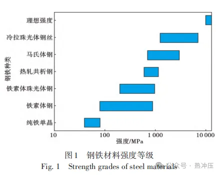 钢铁材料的强度提升一直是材料科学领域的重要课题。材料宏观性能的差异根源于其微观组织。具体而言,材料的强度与其内部组织的特定构型存在强关联性。不同形态的微观组织通过截然不同的强化机制发挥作用,从而导致其强度值呈现出巨大差别,如图1所示。纯铁单晶的强度仅为约80 MPa,铁素体钢可达900 MPa,铁素体-珠光体钢达1 000 MPa,热轧共析钢超过1 000 MPa,马氏体钢可达3 GPa,冷拉珠光体钢丝超过7 GPa,而理想强度约为13 GPa。