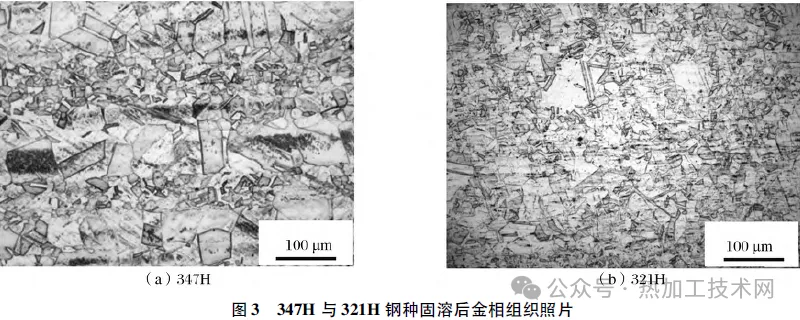 (1)321H钢种固溶后在晶界位置与晶内均析出较大的第二相颗粒;347H钢种固溶后第二相组织溶解较为充分,仅存在一些细小的第二相弥散分布于基体中,固溶效果优于321H钢种。 (2)347H与321H钢种固溶处理后均存在不同形式的“混晶”,347H“混晶”后形成明显细晶层与粗晶层累积堆叠现象。 (3)在不同厚度规格下,347H钢种展现出良好的屈服强度与抗拉强度,321H钢种延伸率未随厚度变化而变化,表现出良好的稳定性。