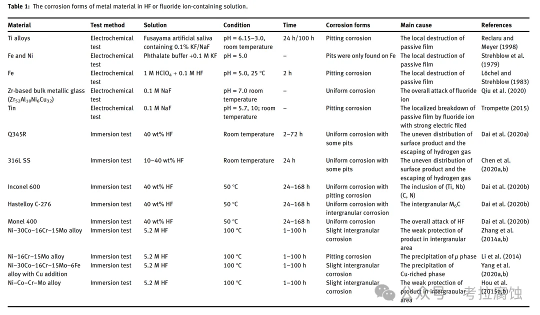 《Recent progress on the corrosion behavior of metallic materials in HF solution》系统介绍