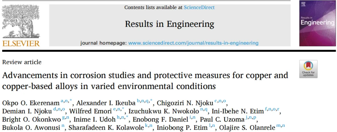 近期发表在《Results in Engineering》上的一篇重要综述文章,系统梳理了铜及铜基合金腐蚀研究与防护技术的最新进展,揭示了多项关键亮点: