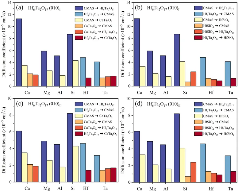 文章重点内容介绍 本文以长周期正交结构的超高温陶瓷Hf6Ta2O17为核心对象,首次从原子尺度系统揭示了其在极端服役环境下抗CMAS腐蚀性能的本质机理。结合第一性原理密度泛函理论(DFT)与从头算分子动力学(AIMD)方法,构建了CMAS/ Hf6Ta2O17(010)界面模型,从结构能量、扩散动力学及反应热力学等方面深入剖析了腐蚀过程的原子演化行为。结果发现,在超过1523 K的高温下,CMAS中的Ca、Si元素具有较高的扩散活性,能够穿透界面并与Hf、Ta发生化学反应,在界面快速生成致密的腐蚀产物层。主要产物CaTa2O6与HfSiO4均具有极高的热稳定性和较快的生成速率,能在CMAS熔体环境中长期保持结构完整,形成高密度、低扩散的防护层。计算进一步表明,这一反应为放热过程,扩散势垒较低,说明反应自发且稳定(如图1、2);同时,腐蚀产物层的存在显著降低了Ca、Si等元素的扩散系数(如图3)。热力学分析显示,Hf6Ta2O17与CMAS的反应自由能远低于传统YSZ(如图4),与实验中观察到的致密保护层形成过程高度一致。如图5所示,CMAS/Hf6Ta2O17的腐蚀过程可分为四个阶段:初始阶段CMAS颗粒附着于涂层表面;随温度升高,CMAS熔融并与基体发生快速互扩散;在高温下界面生成稳定的CaTa2O6和HfSiO4反应层;随着时间延长,该反应层逐渐致密化并显著降低元素扩散速率,从而阻止CMAS的进一步渗透。结合上述分析可知结合上述分析CMAS虽与Hf6Ta2O17发生反应,但生成的CaTa2O6–HfSiO4复合层反而成为阻止后续侵蚀的天然屏障。本研究不仅从原子尺度揭示了Hf6Ta2O17涂层的抗腐蚀本质,也为未来设计具有自防护和超高温稳定性的热障涂层提供了新的理论支撑与设计思路。 图1 CMAS/Hf6Ta2O17(010)I 不同扩散路径的扩散活化能 图2 CMAS/Hf6Ta2O17 (010)Ⅱ 不同扩散路径的扩散活化能 图3 界面相对不同元素扩散系数的影响:(a)CMAS/Hf6Ta2O17(010)I与CMAS/CaTa2O6(100)/Hf6Ta2O17(010)I的对比;(b)CMAS/Hf6Ta2O17(010)I与CMAS/HfSiO4(100)/Hf6Ta2O17(010)I的对比;(c)CMAS/Hf6Ta2O17(010)II与CMAS/CaTa2O6(100)/Hf6Ta2O17(010)II的对比;(d)CMAS/Hf6Ta2O17(010)II与CMAS/HfSiO4(100)/Hf6Ta2O17(010)II的对比。A➜B表示元素从相A向相B的扩散,其中A和B为两种不同的相。 图4 反应自由能随温度的变化 图5 CMAS/Hf6Ta2O17热障涂层(TBCs)腐蚀过程的四阶段示意图