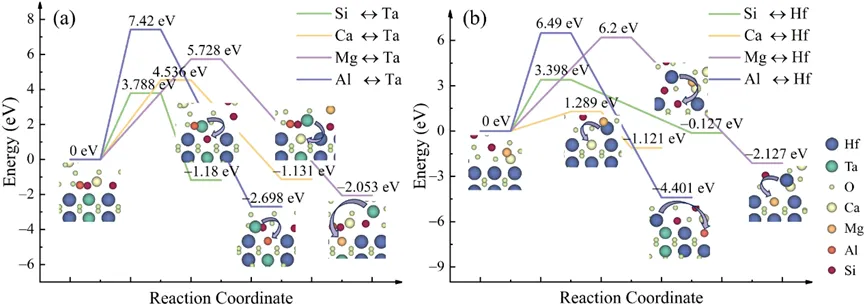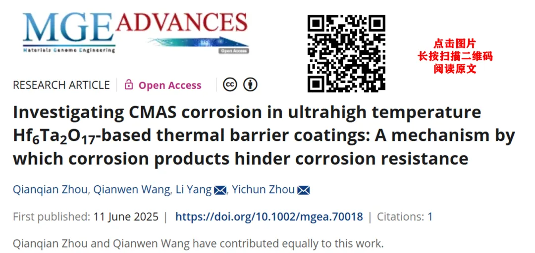 文章引用: Zhou Q, Wang Q, Yang L,Zhou Y. Investigating CMAS corrosion in ultrahightemperature Hf6Ta2O17-based thermal barriercoatings: A mechanism by which corrosion productshinder corrosion resistance. MGE Advances. 2025;e70018. https://doi.org/10.1002/mgea.70018 摘要 Hf6Ta2O17陶瓷兼具优异的热学与力学性能,并具有高达2244 °C的相变温度,被认为是新一代超高温热障涂层(TBCs)的理想候选材料。然而,在高温服役条件下,钙镁铝硅酸盐(CMAS)熔体对热障涂层的化学腐蚀是导致其结构失效的关键因素之一。为揭示Hf6Ta2O17在高温下优异抗CMAS腐蚀性能的内在原因,本文基于密度泛函理论(DFT)对CMAS/Hf6Ta2O17体系进行了界面反应与扩散行为分析。结果表明,CMAS与Hf6Ta2O17之间的相互作用具有较低的反应能,促使界面能够快速生成致密而稳定的腐蚀产物层,主要由CaTa2O6和HfSiO4组成。该反应层显著降低了CMAS中元素向基体内部的扩散速率,从而有效阻止了腐蚀的进一步发展。这种界面自钝化机制使Hf6Ta2O17在高温CMAS环境中表现出优异的化学稳定性,进一步强化了其作为下一代超高温热障涂层材料的应用潜力。
