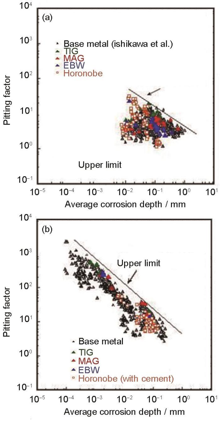 溶液中发生应力腐蚀开裂,但是这种应力腐蚀开裂与材料采用的热处理工艺有关。Kasahara和Adachi[48]研究了热处理和焊接工艺对钢应力腐蚀开裂敏感性的影响,表明热处理导致的金属微观组织的改变会影响金属的应力腐蚀开裂敏感性。除应力腐蚀开裂外,焊接还可能加速金属的腐蚀损伤[37]。因此,有必要考虑处置容器罐体和顶盖之间的密封方式和焊接参数(热输入和冷却速度等),确定焊接部位的腐蚀行为及其对应力腐蚀开裂敏感性的影响。日本拟通过选择合适的焊接和热处理工艺、参数和严格的质量控制措施,获得与处置容器罐体耐蚀性相当的焊接部位,降低碳钢作为处置容器发生应力腐蚀开裂的风险。