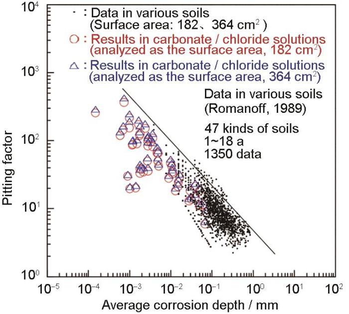 /Cl-的溶液和土壤中的平均腐蚀深度和点蚀因子之间的关系[51,52]