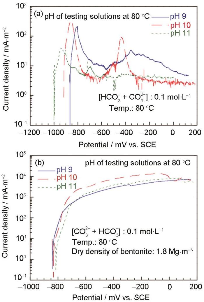 Fig.3 Variations of anodic polarization curve of carbon steel with pH value of the testing solutions: (a) solutions, (b) saturated bentonite[13,56]