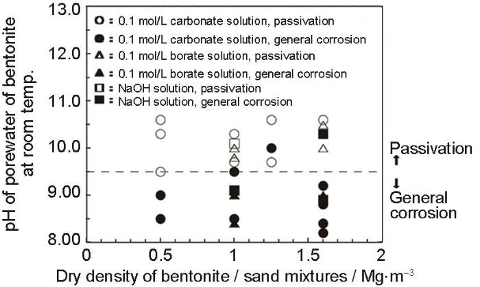 溶液饱和的膨润土中不发生阳极钝化。随后,Taniguchi等[13]将碳钢电极试样安装在用上述pH = 10的测试溶液饱和的、不同干密度的膨润土中,结果显示,碳钢只在最低干密度为0.5 mg/m3的膨润土中发生钝化,而在1.2~1.8 mg/m3的较高干密度的膨润土中不发生钝化,如图4所示。这说明与测试溶液的水化学相比,测试溶液饱和的膨润土孔隙水的水化学可能发生了改变,从而影响了碳钢的腐蚀行为。Taniguchi等[51]进一步研究了可以使碳钢由均匀腐蚀向钝化转变的缓冲材料(70%膨润土和30%石英砂的混合物)孔隙水的pH,以及溶液pH、缓冲材料干密度和缓冲材料孔隙水pH之间的关系。试验的统计学规律表明,碳钢一般在缓冲材料孔隙水pH大于等于9.5的环境中发生钝化,且缓冲材料孔隙水的pH随着干密度的增加而降低,如图5和6所示[51]。为使碳钢在干密度为1.6 mg/m3的缓冲材料中发生钝化,用于饱和缓冲材料的地下水pH应大于11.5 (图6所示)。Wieland等[57]研究表明,缓冲材料孔隙水的pH降低可能是氢离子从蒙脱石边缘的羟基中解离造成,并且这种现象随膨润土的干密度增加而更加明显[22,38]。在日本,较高CO