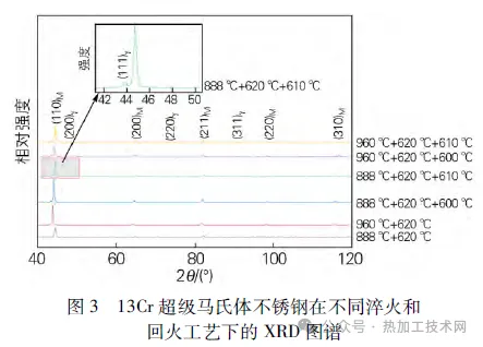 2.1 微观组织形貌 图1为13Cr超级马氏体不锈钢经淬火+一次回火后的显微组织。可以看出,888℃+620℃试样的晶粒明显比960℃+620℃试样更细小,碳化物也明显更多,大量的黑色碳化物与铁素体分布在马氏体板条交界处和马氏体的内部。经测定,888℃+620℃和960℃+620℃试样的晶粒度分别为7.5级和8.0级,且晶粒中无带状组织。 图2为13Cr超级马氏体不锈钢在不同淬火+回火工艺下的SEM图,可以明显地看到原奥氏体晶界与马氏体组织,片状马氏体在原奥氏体内形成并具有一定取向,同一奥氏体晶粒中一般具有多个不同取向的马氏体组织。对比图2(a,b) 可以看出,进行一次回火时,888℃+620℃试样的马氏体更加细小,而960℃+620℃试样的马氏体相对于888℃+620℃试样更加明显,且马氏体边界呈亮白色,这种高亮马氏体组织为富Ni马氏体组织,该马氏体组织中富含大量的奥氏体稳定元素Ni。当其中Ni达到一定含量时能够将高温逆转变奥氏体组织保留至室温,一般逆转变奥氏体也在富Ni马氏体组织周围形成,如图2(c) 所示。同时,888℃+620℃试样的组织中存在大量铁素体,在进行二次回火后出现大量的富Ni马氏体组织与逆转变奥氏体,如图2(c,d) 所示。相比于888℃+620℃+610℃试样,888℃+620℃ + 600℃试样的铁素体更加细小,富Ni马氏体更加细小且分布更加均匀。另外,由图2(e,f) 可见,对960℃+620℃试样进行600和610℃二次回火后得到的富Ni马氏体含量更多,马氏体板条更加明显,同时马氏体板条也更加细小,这表明二次回火能使得马氏体不锈钢组织细化,提高马氏体不锈钢逆转变奥氏体的含量。 对比图2(c,d) 和图2(e,f) 可知,888℃+620℃+600℃试样和888℃+620℃+610℃试样的富Ni马氏体更多,马氏体间距更小,产生的逆转变奥氏体更多,但铁素体也更多。这是因为铁素体能够细化马氏体板条,增加逆转变奥氏体的形核点,提高逆转变奥氏体含量。在一次回火时,高温下能产生大量的逆转变奥氏体,但由于奥氏体稳定元素的含量不足,在室温时大量的高温逆转变奥氏体重新转变为富Ni马氏体。在二次回火时,富Ni马氏体为逆转变奥氏体提供大量的形核位置,使得高温逆转变奥氏体大量形核,即使在二次回火冷却时一些Ni 含量不足的逆转变奥氏体会重新转变为新的马氏体,从而降低逆转变奥氏体含量,但仍有大量的逆转变奥氏体被保留至室温,因此二次回火后的试样相较于一次回火后的试样具有更多的逆转变奥氏体以及更加细小的富Ni马氏体组织。 综合来看,888℃亚温淬火+回火后的组织主要为回火马氏体+铁素体+逆转变奥氏体,960℃淬火+回火后的组织主要为回火马氏体+逆转变奥氏体,所有工艺回火后都出现了亮白色的富Ni 马氏体组织以及碳化物,亚温淬火+回火后的组织比淬火+回火后的组织更加细小。 2.2 XRD分析 图3为13Cr超级马氏体不锈钢在不同淬火+回火工艺下的XRD图谱。可以看出,二次回火后的试样中存在明显的( 111) γ奥氏体峰,而在淬火+一次回火的试样中的( 111) γ奥氏体峰相对而言并不明显。结合显微组织分析可知,在888℃+620℃试样中铁素体与回火马氏体共存。王鹏证实,13Cr超级马氏体不锈钢在本文所用的淬火区间淬火时基本不会产生残留奥氏体。同时残留奥氏体与逆转变奥氏体的XRD图像也不同,残留奥氏体的XRD图像中的峰并不对称,这与逆转变奥氏体的对称图像不同。 图4为13Cr超级马氏体不锈钢在不同淬火+回火工艺下的逆转变奥氏体含量。可以看出,进行一次回火时,888℃+620℃试样的逆转变奥氏体含量相对于960℃+620℃试样提升了83.55%。在进行二次回火后,逆转变奥氏体含量明显增加,其中888℃+620℃+610℃试样较888℃+620℃ 试样增加了86.70%,960℃+620℃+600℃试样较960℃+620℃试样增加了140.54%。因此,适宜的二次回火能够显著增加马氏体不锈钢中逆转变奥氏体的含量。这是因为在一次回火的加热阶段时,逆转变奥氏体会在马氏体边界或其他异质点形核。在保温阶段时,大量的奥氏体稳定元素(Ni、C) 会通过扩散聚集在逆转变奥氏体内,使逆转变奥氏体长大。在冷却阶段时,由于部分逆转变奥氏体内的稳定元素不足,使得逆转变奥氏体重新转化为新的马氏体。新的马氏体同样因内部含有大量的奥氏体稳定元素,当进行二次回火时,逆转变奥氏体优先在此处形核并长大,随后在保温阶段时,逆转变奥氏体内的稳定元素重新聚集,使得第二次回火保温阶段的逆转变奥氏体含量高于一次回火保温阶段,虽然在冷却过程中依然有一部分稳定元素含量不足的逆转变奥氏体转化为马氏体,但当冷却到室温时,二次回火后的逆转变奥氏体含量依然比仅进行一次回火时更高。 另外,对比不同二次回火后工艺的逆转变奥氏体含量可知,888℃+ 620℃+610℃试样比888℃+620℃+600℃试样增加了38.21%,960℃+ 620℃+600℃试样比960℃+620℃+610℃试样增加了12.07%,表明回火温度对逆转变奥氏体含量有着一定的影响。而888℃+620℃+610℃试样比960℃+620℃+610℃试样增加了59.47%。说明亚温淬火后产生的铁素体能有效地增加马氏体不锈钢的逆转变奥氏体含量。这可能是因为铁素体的存在使得边界增加,增加回火时逆转变奥氏体的形核点,提高逆转变奥氏体的形核几率。逆转变奥氏体在铁素体周围大量形核,即使在冷却过程中有损耗,仍然有大量的逆转变奥氏体保存至室温。 综上,888℃×1h水淬+620℃×6h 回火+610℃×3h 回火试样的组织中具有最多的逆转变奥氏体组织,铁素体有利
