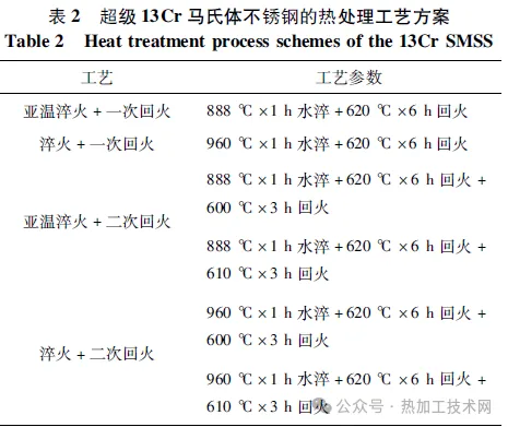 试验材料选用圆柱形正火态13Cr 超级马氏体不锈钢(13Cr SMSS) ,其化学成分如表1所示。将加工后的板材(60mm×60mm×15mm) 和棒材(210mm×15mm×15mm) 放入热处理炉中分两组进行淬火+回火试验,淬火介质为水,回火后空冷,具体方案如表2所示。淬火温度由经验公式(1) 计算得出Ac3约为918℃,淬火温度通常取Ac3 ± (30~50) ℃,其中Ac3 -( 30~ 50) ℃ 为亚温淬火,Ac3+ (30~50) ℃为淬火。因此888℃为亚温淬火温度,960℃为淬火温度。 查阅文献后发现,许多研究已经确定了一个大致的、性能良好的、具有较高逆转变奥氏体含量的回火区间( 580~650℃) ,为了获得更加精确的回火温度并且保证一定的精确度,因此选择在一定区间范围内进行温度差仅为10℃的回火。已有试验证实二次回火有利于RA 的生成,为了探寻二次回火对SMSS中RA含量的影响,本文同时进行先在620℃回火,再在600和610℃下进行二次回火。下文以淬火和回火温度简记不同工艺试样。 将试样打磨抛光至无划痕后用2%硝酸酒精溶液进行腐蚀,使用OLS 4100激光共聚焦显微镜观察组织,按照GB/T 4335—2013《低碳钢冷轧薄板铁素体晶粒度测定法》进行晶粒度的评定。将热处理后的试样在10g FeCl3+30mLHCl +120mL去离子水配成的腐蚀液中侵蚀约20s,然后立即用清水冲洗试样表面,再用酒精清洗并快速吹干,然后进行SEM分析,用来观察试样的微观组织。将热处理后的试样打磨干净后进行XRD测试,试验采用靶为Cu靶,扫描范围为40°~120°,扫描速度为2°/min,工作电压为40kV,工作电流为100mA。根据所得XRD数据,分别采用马氏体基体所对应的α相( 200) 、( 211) 衍射峰强度和奥氏体所对应的γ相( 200) 、( 220) 和( 311) 衍射峰强度,由公式( 2) 和公式( 3) 进行逆转变奥氏体含量的计算: 式中:Vα为马氏体的体积分数;Vγ为奥氏体的体积分数;Iα为马氏体衍射峰的积分强度;Iγ为奥氏体衍射峰的积分强度。 按照ASTM A370-22《钢制品力学性能试验的标准试验方法和定义》,采用UTM5305 材料试验机进行拉伸试验,采用PIT302D 冲击试验机进行低温冲击试验( 液氮冷却至-46℃) ,拉伸试样尺寸为200mm×12.5mm×12.5mm,冲击试样尺寸为10mm×10mm×55mm,V型缺口,每组取3个平行试样进行试验,减少其他因素的影响。按照ASTM E18-22《金属材料洛氏硬度的标准试验方法》,采用RB2002T 洛氏硬度计进行硬度测试,试样尺寸为50mm× 20mm×10mm。相隔至少5mm取点,测试6个数据并计算平均值作为最终结果。