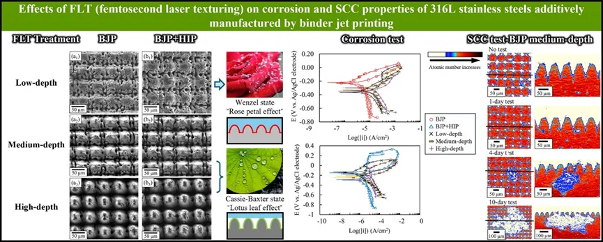 该研究通过200、400、800次飞秒激光扫描(FLT)分别在粘结喷射打印(BJP)及热等静压处理(HIP)的316L不锈钢表面制备低、中、高深度织构,发现中深度FLT可使BJP 316L呈超疏水性并,显著提升其局部耐腐蚀性与应力腐蚀开裂(SCC)抗性至HIP处理材料水平,降低BJP+HIP 316L局部耐腐蚀性,证实FLT是增强增材制造316L不锈钢耐蚀性能及抗SCC性能的有效后处理手段。