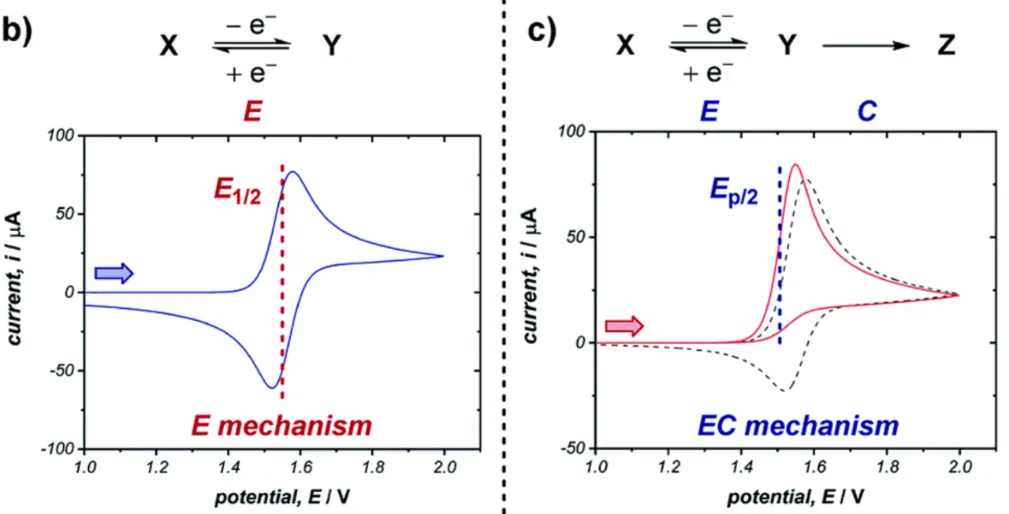 对于可逆、准可逆与不可逆反应体系,CV 曲线在峰形、峰电位间距及峰电流特征上呈现系统性差异,可用于判定电子转移的可逆性、反应机理及传质控制模式。