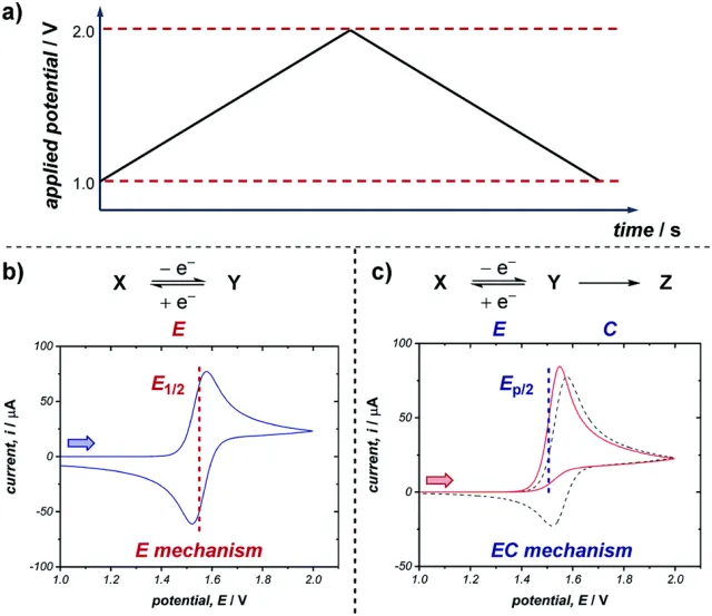 在电位以三角波形式连续变化的过程中,体系中氧化还原对的电子转移行为因外加电位的调控而被依次触发,所得伏安曲线反映了电活性物质的氧化、还原过程以及界面双电层结构、扩散传质等因素对电流响应的综合影响。
