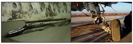 1 服役环境对飞机抗腐蚀能力的影响 腐蚀环境的影响因素主要包括空气湿度、温度、盐雾、太阳辐射、酸性大气、砂尘、机械环境(拉伸和弯曲疲劳、振动疲劳、摩擦磨损)和诱发高温环境。 1)湿度的影响。湿度是影响腐蚀的主要环境因素,当相对湿度达到临界值时,金属腐蚀速率会急速增加,温度和湿度的协同作用更进一步加速了飞机的腐蚀。湿度加速了非金属材料的老化,对机载产品而言,密封材料的破坏会影响对机载设备的稳定性、绝缘性、点火电压和体绝缘电阻。在交变湿热循环中,箱体结构产生的呼吸效应造成箱内环境的湿度增大,提高了产品发生腐蚀的概率。 2)温度的影响。温度影响产品表面水膜的停留时间和状态、水汽的扩散速率、腐蚀反应速率以及水膜中各种腐蚀性气体和盐类的溶解度、水膜的电阻以及腐蚀电池中阴、阳极过程的反应速度。 3)盐雾的影响。盐雾中的Cl–具有极强的穿透性,对其钝化膜的破坏性极强,容易产生点蚀,且引起点蚀向纵深扩散,是造成材料腐蚀失效的重要因素之一。 4)太阳辐射的影响。太阳辐射环境的影响效应体现在热效应和光化学效应老化2个方面。因材料的膨胀系数不同,在热效应作用下可能会产生运动机构的卡滞,零部件因应力集中而造成破坏等,对温度敏感的元器件高温和局部过热失效等,其中紫外线的影响最大。光化学效应主要影响非金属材料,包括织物和塑料变色,涂层开裂、粉化和变色,聚合物发生交联反应和断链反应等。 5)酸性大气的影响。海洋环境下的酸性大气主要舰船、飞机等的排放的SO2,能够通过吸附扩散溶解于设备表面的液膜中,并发生水合反应和电离反应。主要影响包括腐蚀和产品的绝缘降低、接触不良。 6)砂尘环境的影响。砂尘环境的影响主要包括砂尘冲刷作用引起的产品表面的磨损、运动部件的卡滞,捕获腐蚀介质,引起腐蚀。另外,珊瑚砂中附着的盐粒子也加速了产品的腐蚀。 7)机械环境的影响。机械环境不会使飞机直接发生腐蚀,但会促进腐蚀的发生和发展。主要影响环境包括疲劳、振动、摩擦磨损环境。在疲劳载荷的作用下,结构连接部位产生相对位移,破坏了连接处的装配防护体系,腐蚀介质从缝隙进入后产生腐蚀。 振动载荷的影响主要体现在以下几方面,一是破坏材料的内部组织,特别是树脂类材料在振动载荷作用下,可能会导致材料中的添加剂与树脂间的微观界面破坏,从而影响材料的性能。二是在振动载荷作用下,管路等零件与其他零件产生摩擦,破坏原有的防护体系及零件表面光洁度,从而产生腐蚀。另外,接插件长期在振动载荷的作用下,接插配合部位可能会产生微缝隙,腐蚀介质进入后导致腐蚀的发生。摩擦磨损的影响主要体现在摩擦力破坏对防护层的完整性,降低了零件的表面光洁度。 2 飞机腐蚀损伤效应 根据服役环境对飞机抗腐蚀能力的影响分析结果,总结飞机腐蚀效应包括纯腐蚀/老化、腐蚀与电应力耦合、腐蚀与机械磨损耦合、腐蚀与机械应力耦合等损伤类型。 2.1 纯腐蚀/老化 以金属结构电化学腐蚀(包括涂覆防护下的金属腐蚀)和非金属材料的老化为主要损耗机制。主要腐蚀类型包括均匀腐蚀、电偶腐蚀、缝隙腐蚀、点蚀、氧化、微生物腐蚀、非金属材料老化等。其中,电偶腐蚀是飞机最常见的腐蚀形式之一,发生在结构连接部位。发生电偶腐蚀主要是由于2种相互接触材料的腐蚀电位不同,低腐蚀电位材料的腐蚀速率加快,高腐蚀电位材料则受到保护。 2.2 腐蚀与电应力耦合效应 在电流反应中,异种金属在电解质的存在下释放或收集电子,电子转移导致金属离子溶出,材料逐渐溶解,引发腐蚀。另外,为了实现电联通,电连接部位无法通过绝缘隔离,需采用直接接触装配,从而形成电路通路,湿热大气、盐雾等腐蚀介质进入后,产生了电偶腐蚀。比较典型的案例包括电连接器插头发生发白、表面上锈(见图1),天线涂层剥落、鼓泡,紧固件锈蚀(见图2)等。 图1 连接器腐蚀 图2 天线腐蚀 2.3 腐蚀与机械磨损耦合效应 在机械摩擦过程中,摩擦表面与周围介质发生化学反应或电化学反应的磨损称为腐蚀磨损,是摩擦作用与电化学腐蚀协同作用的结果。在摩擦过程中,相对运动破坏了材料表面的防护状态和光洁度,加速腐蚀的发生。对于已经发生腐蚀的部位,消除了腐蚀产物,裸露出的纯金属表面在腐蚀环境中很快又被氧化。为此在腐蚀与机械磨损耦合环境作用下,腐蚀和防护机理复杂,是抗腐蚀设计的难点。典型案例包括起落架和起落架、机翼活动舵面、折叠和拦阻机构等外露和开敞部位的运动机构腐蚀,典型作动筒腐蚀见图3。 图3 作动筒腐蚀 2.4 腐蚀与机械应力耦合效应 加速飞机发生腐蚀的机械应力包括飞机制造和服役过程中产生的拉应力、交变疲劳应力与振动应力。 1)腐蚀与拉应力耦合。金属材料在拉应力和腐蚀环境的协同作用下,产生滞后开裂,甚至滞后断裂的现象称为应力腐蚀开裂,是一种脆性断裂现象。图4是美军飞机应力腐蚀图片。 图4 应力腐蚀 2)腐蚀与交变疲劳应力耦合。腐蚀与交变应力耦合效应体现在2个方面,一是金属在腐蚀环境和交变应力同时作用下产生的破坏称为腐蚀疲劳;另一种是拉伸疲劳与腐蚀的交互作用,疲劳作为一种诱发环境,连接的两结构产生微缝隙,为腐蚀介质的进入提供了通路,这也是连接部位容易发生腐蚀的主要原因。 3