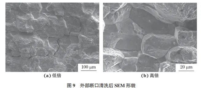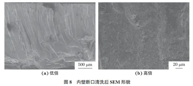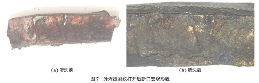 开裂反应釜的宏观形貌如图1所示,开裂位置为靠近釜底处。 反应釜与釜身通过焊接连接,焊接前在釜内壁各预制了一层镍板,然后在外部实施焊接,形成外焊缝。为增加内部密封性,厂商在完成外部焊接后,在内壁又增加了一层镍板(即附加镍板),然后在其上下两处实施焊接,于内壁形成上焊缝和下焊缝 (见图2)。 使用内窥镜检查釜内裂纹分布情况,结果如图3所示。由图3可知:共发现4处裂纹,其中位置1的裂纹出现在下焊缝,位置2~4的裂纹出现在上焊缝,4处裂纹均在焊道中部,裂纹附近呈较明显锈蚀色。 釜外部共有两处发生区域性渗漏,分别与内部位置1,2,以及位置3,4的侧焊缝裂纹处相对应(见图4)。外部裂纹主要沿焊缝边缘的焊趾部位扩展,渗漏区域附近不锈钢釜体发生严重锈蚀,可见大量褐色锈蚀产物附着。 取下部分附加镍板后,观察釜内壁的宏观形貌如图5所示。由图5可知:外焊缝裂纹完全沿焊趾边缘扩展;附加镍板的焊缝边缘裂纹为位置3的裂纹;预制镍板未能完全覆盖住不锈钢釜体,在外焊缝附近有多处裸露,若附加镍板开裂后,釜内的溶液可以直接接触到釜体的焊缝位置。 经观察,位置1~4各外焊缝断口特征一致,各内壁焊缝断口特征一致,选取位置3为代表进行分析。 将内壁上焊缝裂纹人工打开,断口清洗前,断口表面呈灰色+红褐色,表面较脏,可见较多附着物;使用铬酸-硫酸溶液清洗断口后,表面相对干净,断面呈暗灰色(见图6)。 将外焊缝裂纹人工打开,断口清洗前,断口表面呈红褐色,表面较脏,可见较多泥纹状的腐蚀产物;使用铬酸-硫酸溶液清洗断口后,表面相对干净,断面呈黄灰色(见图7)。 内壁断口清洗后的SEM形貌如图 8所示。由图8可知:断口可见典型的柱状晶轮廓,裂纹沿焊缝区域的柱状晶粒晶间开裂;晶面上氧化痕迹较严重。对清洗后断口表面进行能谱分析,发现O元素含量较高(质量分数为25%)。 外部断口清洗后SEM 形貌如图9 所示。由图9可知:断口处可见二次裂纹,断口整体呈“冰糖状”的沿晶断裂特征。对清洗前断口进行能谱分析,得到O元素质量分数为40%,K元素质量分数为15%。 沿断口截取金相试样,将试样进行打磨、抛光、腐蚀处理,试样的低倍形貌如图10所示。由图10可知:内壁预制的镍板并没有完全覆盖住釜体钢板的焊缝表面;A区为外焊缝裂纹,沿焊缝边缘(即焊接热影响区)开裂,逐渐穿透釜体钢板;B区为釜体钢板主体区域;C区为附加镍板的焊缝裂纹位置。 A区显微组织形貌如图11所示,可见裂纹沿晶界开裂,且主裂纹还伴随有裂纹分叉的现象。B区釜体钢板的组织为奥氏体+ 变形滑移线,为典型的奥氏体不锈钢组织(见图12)。C 区附加镍板焊缝区域均呈柱状晶形貌,镍板断口附近的焊接组织呈柱状晶形貌,且在焊缝组织的内部还可见沿晶开裂的微裂纹(见图13)。