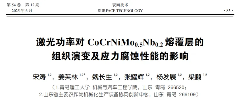 第一作者单位:青岛理工大学 关键词:激光熔覆;高熵合金;激光功率;共晶组织;应力腐蚀 背景与意义: 宋涛, 姜芙林, 魏长生, 张耀辉, 杨发展, 梁鹏. 激光功率对CoCrNiMo0.5Nb0.2熔覆层的组织演变及应力腐蚀性能的影响[J]. 表面技术. 2025, 54(12): 85-96