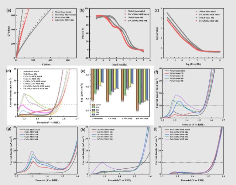 2、“鱼与熊掌兼得”——活性与耐蚀性能的双重提升:FeCoNiOx-MOF在10 mA cm⁻²电流密度下的过电位低至290 mV,Tafel斜率仅为62 mV dec⁻¹,动力学性能优于商用RuO₂。同时,在48小时严苛测试中,其腐蚀电流密度变化率仅为15%,远低于镍基底的30%,实现了催化性能与结构稳定性的双重提升。