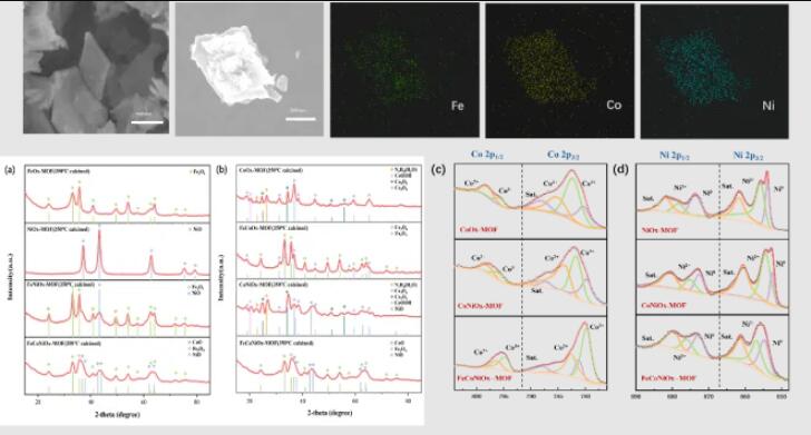 研究团队采用水热法合成了一系列MOF前驱体,并通过精确控温煅烧将其转化为金属氧化物MOF。扫描电镜(SEM)和元素分布图(EDS)结果显示,Fe、Co、Ni三种元素在FeCoNiOx-MOF中呈高度均匀分布,为多元素协同效应提供了结构前提。X射线衍射(XRD)分析进一步揭示,在三元素体系中,Co的价态被稳定在+2价(CoO),而在单钴或双钴MOF中则存在不稳定的Co³⁺(Co₂O₃, Co₃O₄)。这种稳定的低价态得益于Fe和Ni的电子调控,是材料保持长期电化学稳定的关键。