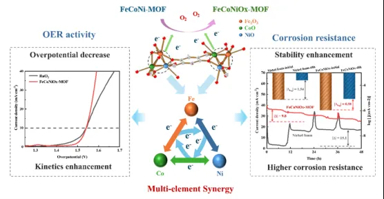 本研究通过一步水热法和煅烧法,合成了过渡金属Fe、Co与Ni的单元素、双元素、多元素MOF氧化物,三元素MOF(FeCoNiOx-MOF)之中,过渡金属位点Fe、Co与Ni之间由于电子云的相互影响,存在一种多元素协同效应。这种效应既是“捷径”,又是“锚钉”。一方面可以显著优化材料的电子传输路径,改善MOF的导电性,提升OER催化性能。另一方面,它可以一定程度上,作为锚钉影响金属位点的浸出,改善应用过程中的腐蚀问题。