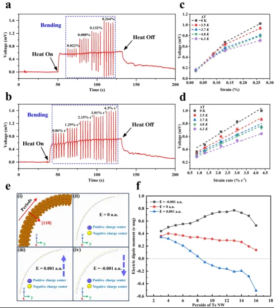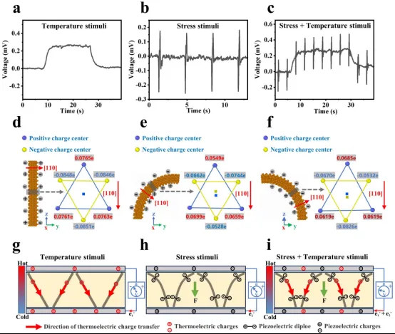 近期,中国科学院金属研究所沈阳材料科学国家研究中心邰凯平研究员带领团队研制出一种基于碲纳米线(Te-NWs)热电-压电耦合效应的柔性、单通道、应变/应变率-温度多模态传感器。研究人员通过材料调控和结构设计克服了以往传统热电材料中热电和压电信号无法在同一方向获得的难题,在倾斜生长的特殊网状Te-NWs结构中,实现了压电信号和热电信号在面外方向的同时感知和输出。传感器具有优异的性能,应变传感灵敏度为0.454 V、应变率传感灵敏度为0.0154 V s、温度传感灵敏度达225.1 μV K-1,优于已报道的同类多模态传感器。同时,结合第一性原理计算,证明了Te原子电荷的变化引起的压电效应,以及外部电场(如热电势等)对于压电信号的调制作用机制。该工作为基于多物理场耦合效应构建柔性、单通道、多模态传感器提供了新思路,也为耦合“纳米发电机”开辟了新的应用方向。
