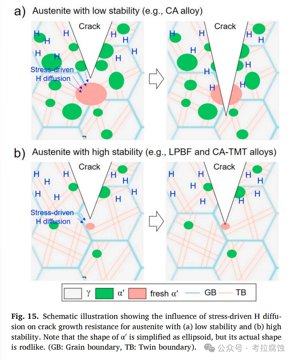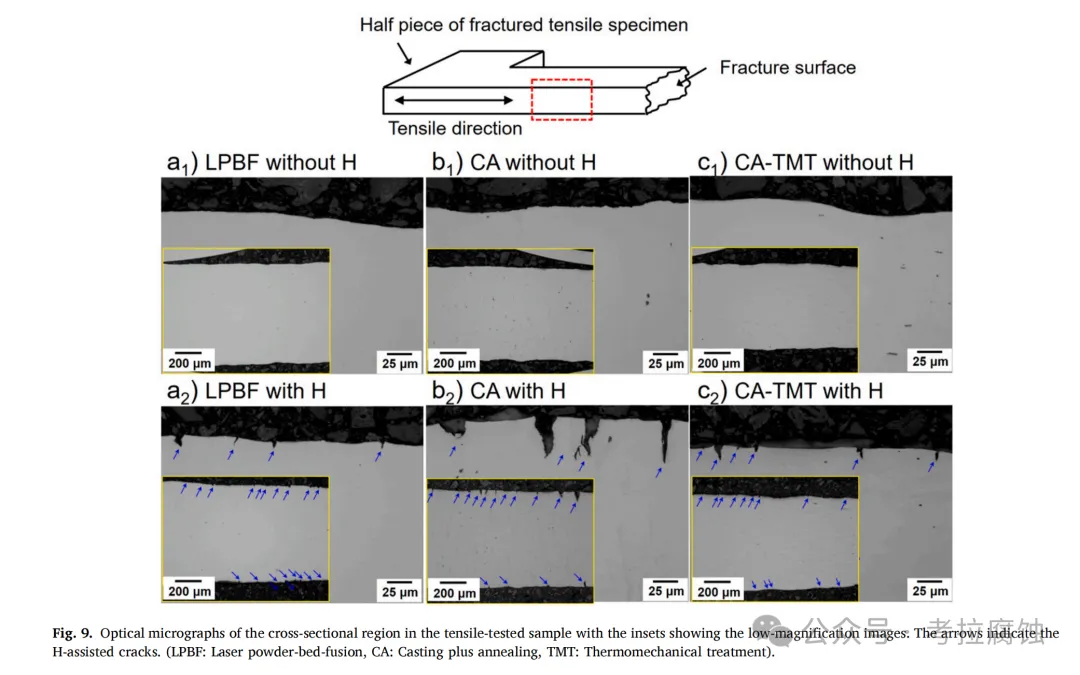 60%应变时,CA样品α'马氏体体积分数约16%,LPBF样品约3%,CA-TMT样品约1%。CA样品的α'马氏体增多与残留δ铁素体和化学不均匀性相关。 - 氢辅助开裂