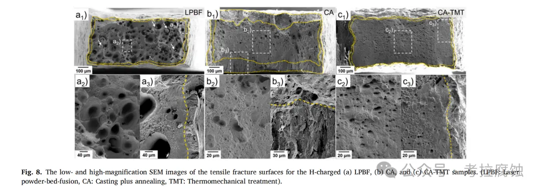 CA样品的延展性损失程度大于LPBF和CA-TMT样品。氢脆敏感性用εf,H/εf,0(充氢与未充氢延伸率比值)表示,CA样品的值低于LPBF和CA-TMT样品。