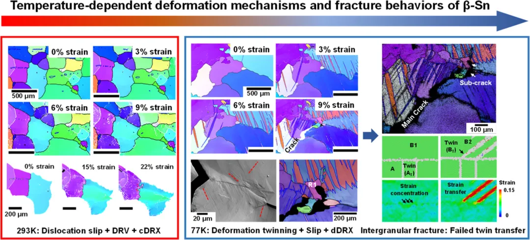 Sn基焊料是电子封装中关键连接材料,但随着现代电子系统的快速发展,其应用场景也逐渐扩展,但Sn基焊料在深冷温度下的力学可靠性成为电子系统的重要限制因素。β-Sn具有较低的熔点(505 K),在室温下,β-Sn能够通过位错滑移、动态回复和连续动态再结晶(cDRX)展现出优异的延展性,但一旦温度继续降低至77 K,塑性会骤然下降,表现出典型的脆性断裂行为。