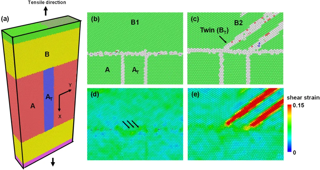 团队通过分子动力学模拟进一步验证了机理孪生传递对应力分布的关键影响,在模拟的过程中,当孪生在晶界处被阻断时变形孪生的终止点会成为应力集中的区域,在应变过程中局部区域发生显著的应变集中,并大概率成为新的微裂纹的萌生点,这一模拟结果与实验观察到的沿晶界脆断一致。