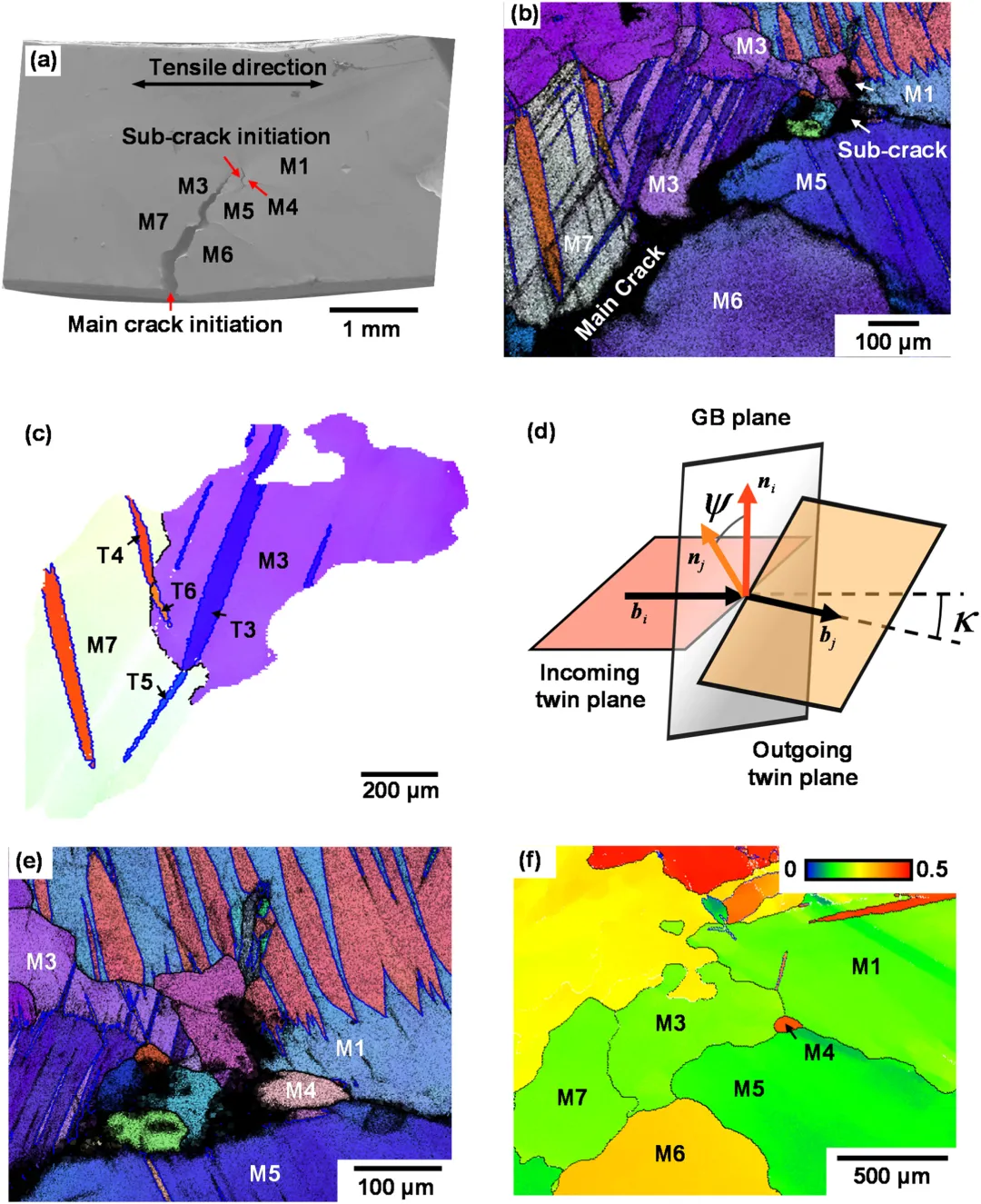在低温环境下,裂纹主要沿晶界传播,表现为典型的沿晶界断裂模式,进一步分析表明,裂纹一侧的晶粒(如M3、M7)发生大量孪生,而另一侧(如M6、M5)孪生显著不足,双边塑性出现较大的不匹配。当孪生在晶界处受阻时,本应被跨晶界孪生吸收和分散的局部应变被迫堆积于晶界处,引发强烈应力集中,最终促使晶界开裂。孪生能否跨界传递并非仅由Schmid因子(外加载向控制)决定,还高度依赖几何相容性因子m',当孪生几何相容性较差时,即使晶粒具备较高的孪生驱动力,也难以发生孪生传递,从而导致应力无法疏导。