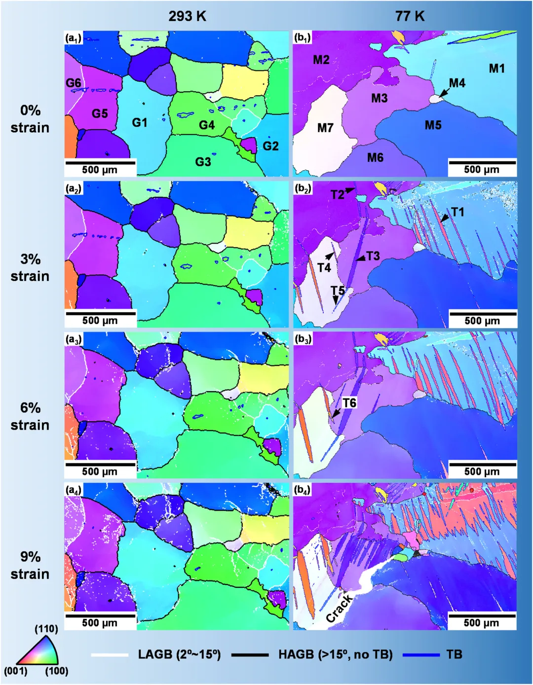 研究团队制备了平均晶粒尺寸约300 μm的多晶β-Sn试样,通过准原位单轴拉伸实现温度为293 K与77 K两种条件下的微观结构演化跟踪,293 K试样依次在0%、3%、6%、9%、15%与22%应变量下进行SEM/EBSD表征,而77 K试样在9%应变时即发生提前断裂,因此仅能记录至此。团队利用EBSD的IPF、KAM、晶界类型统计等指标系统表征变形机制,同时结合孪生迹线分析与Schmid因子、Luster-Morris几何相容性因子(m')计算,判定孪生激活及跨晶界传递行为。此外,基于实验观察构建的晶粒模型被引入分子动力学模拟,用于捕捉孪生-晶界相互作用导致的应力传递与局部应变分布,从而验证实验揭示的脆化机制。