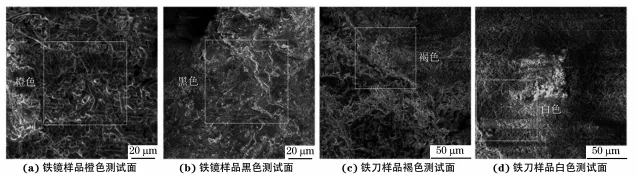 采用数字光学显微镜观察发现,铁镜锈蚀粉末整体粒径为38~273μm、铁刀锈蚀粉末整体粒径为36~310μm,二者均呈现较宽的粒径分布。铁镜样品的较大颗粒主要有三种形貌特征:橙色锈蚀、褐色橘皮状锈蚀和黑色蜡状反光物质,其中橙色锈蚀周围常伴有土黄色浮土类物质。铁刀样品大颗粒多为片状,一面白色为主,另一面褐色为主。白色的一面应为土壤埋藏环境中可溶盐析出,褐色的一面则为铁锈附着(图略) 。