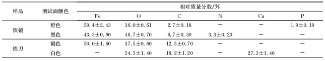 由铁器锈蚀包埋样品线扫描位置及结果(图略)可见,铁镜锈蚀包埋样品Fe和O伴随分布、几乎无C,说明铁镜锈蚀包埋样品是相对均匀的致密铁氧化物。铁刀锈蚀包埋样品Fe和O伴随分布、但检出较多C(包埋材料环氧树脂所致),说明铁刀锈蚀包埋样品的锈蚀相对疏松,而且C在300~700μm和1000~1300μm检出较多、在 700~1000μm检出较少,说明橙色锈蚀比褐色锈蚀更加疏松,这也与上文偏光显微镜的讨论结果一致。