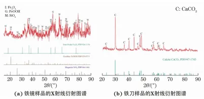 图6是铁器锈蚀产物的X射线衍射图谱。与数据库中标准物质谱图对比可知,铁镜锈蚀产物的主要物相为磁铁矿和针铁矿,同时含有莫干石,而铁刀表面白色锈蚀产物主要为碳酸钙结壳。
