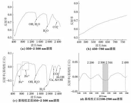 由图3可见,在白色区域的光谱曲线1400nm、 1900nm处出现羟基吸收峰,在2300nm 附近出现碳酸根吸收峰。其可见光波段的光谱呈典型的白色系“斜线”型。经过基线校正,光谱在 600~1100nm范围内呈现多个弱吸收峰,应源于铁离子迁移。2200nm处吸收峰对应Ca及Al-OH,2300~2344nm范围的宽吸收峰对应碳酸根,而2490nm处吸收峰对应Al-OH。综合分析表明,白色区域的主要成分为碳酸钙,同时含有伊利石等黏土矿物。