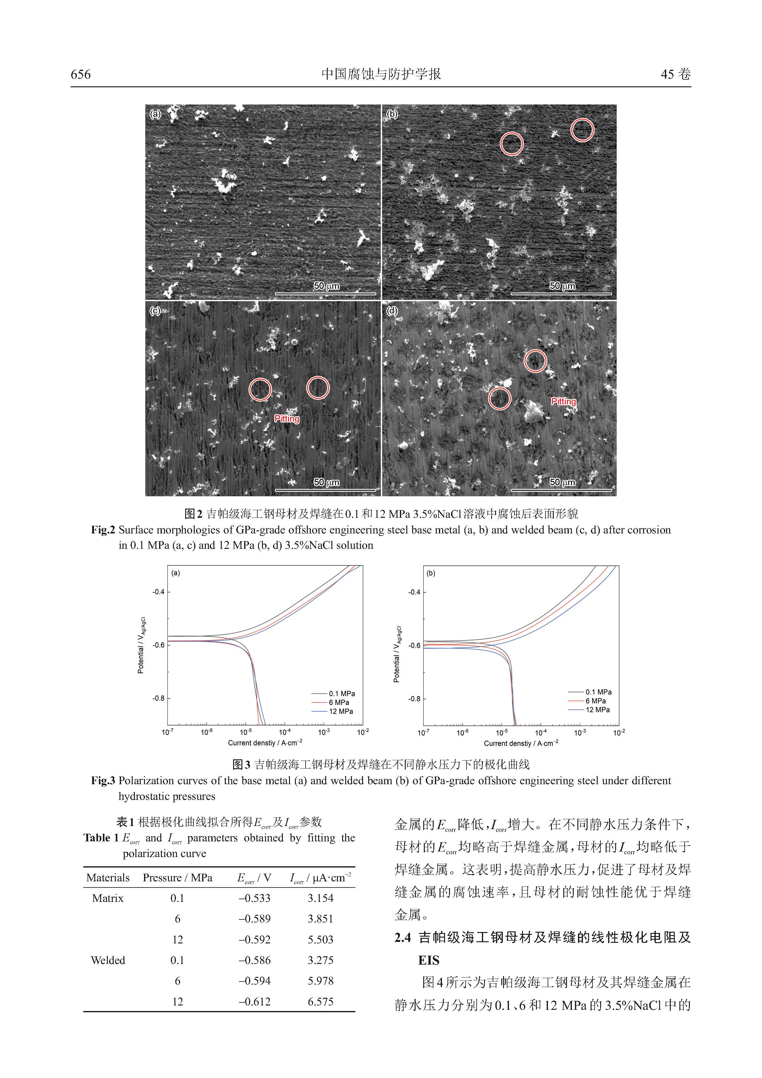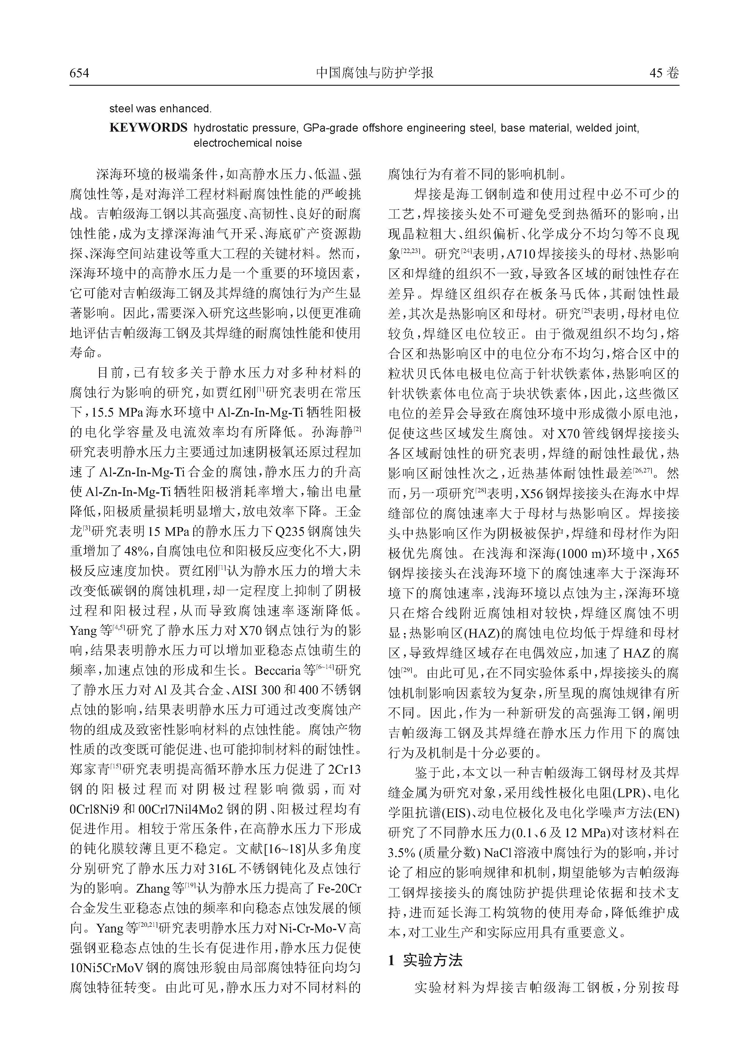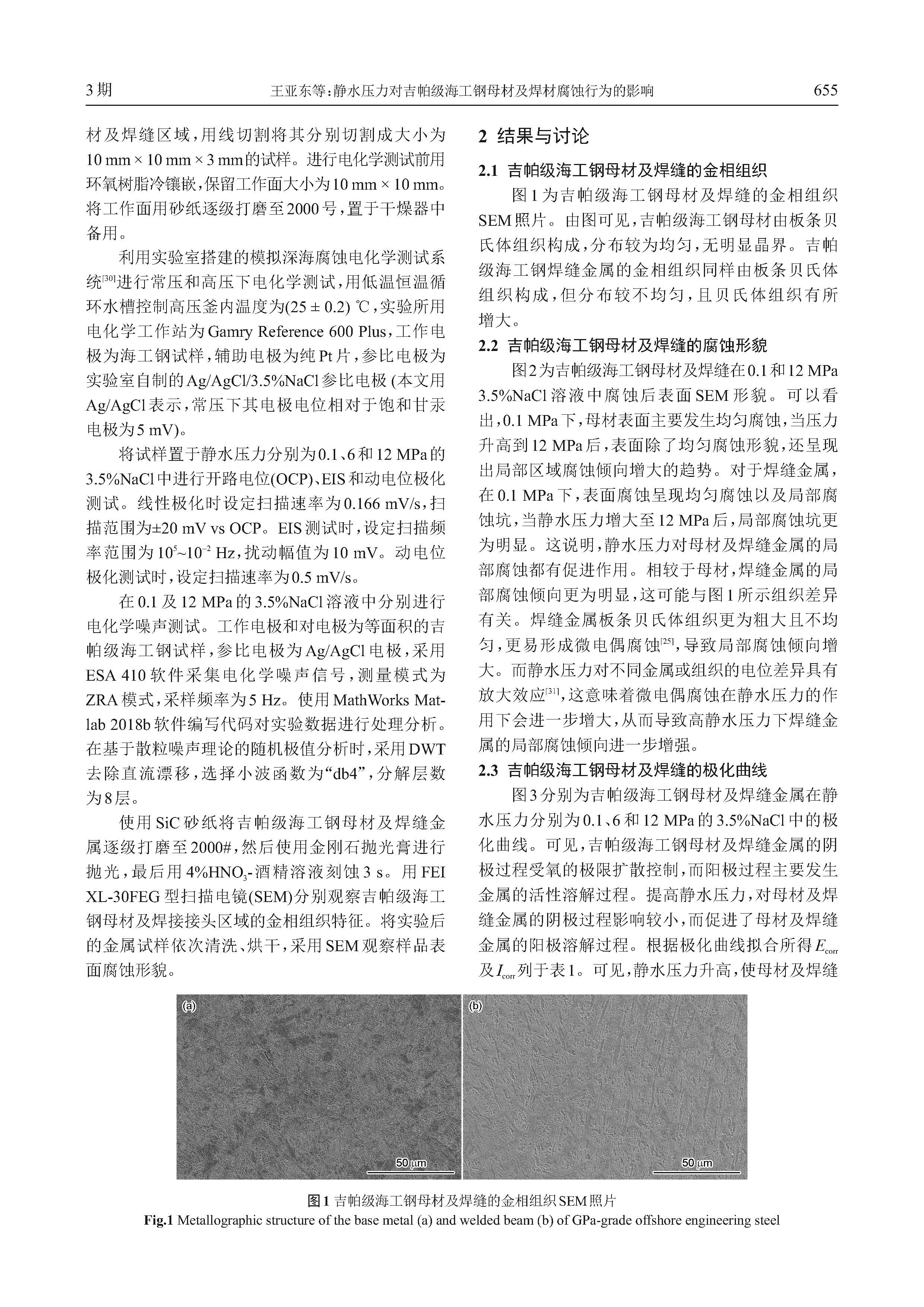 静水压力对吉帕级海工钢母材及焊材腐蚀行为的影响