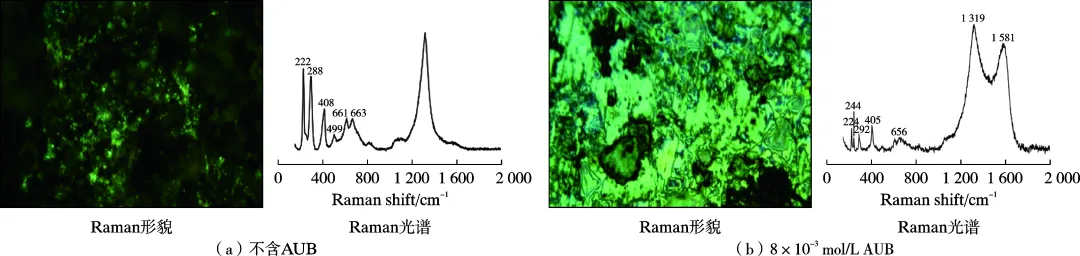 Q235钢不含或含8×10-3 mol/L AUB的酸性模拟油田采出水中的Raman形貌和Raman光谱