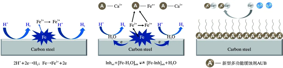 Highlight 1 AUB对Q235钢在酸性模拟油气田采出水溶液中表现了显著的缓蚀性能。AUB在Q235钢表面通过N、O杂原子与Fe原子之间的相互作用展现以化学吸附为主的混合型吸附。在298 K下,添加8×10-3 mol/L的AUB缓蚀效率可达90%,其缓蚀效率随着AUB浓度的增加而增大。在358 K下,仍能达到80%以上的缓蚀效率。对碳钢表面形貌进行表征后,可以明显观察到AUB在碳钢表面形成致密有序的薄膜结构。含C=C、羧酸酯基团的共轭链和中间短链包含高度电负性的共轭体系显著增加了AUB分子在Fe表面的活性吸附位点,并通过形成更多更短的化学键形成致密的保护膜,有效抑制了碳钢的腐蚀。 2 在阻垢性能方面,与基本的苯并咪唑相比,在AUB分子中引入含C=C、羧酸酯基团中间短链的共轭体系,有效提高了AUB在高垢质环境中的防护性能,和钙离子之间的配合抑制了钙离子的自由运动,AUB可以紧密吸附在CaCO3晶体的活性生长位点上,也可以物理吸附形式吸附在碳酸钙-方解石的表面上,从而可能阻碍其正常生长并抑制水垢形成。 3 在杀菌性能方面,AUB通过破坏SRB的生物膜来发挥作用,从而抑制SRB的生物活性。这种破坏不仅减少了SRB的直接腐蚀影响,而且加强了在存在SRB的环境中防止腐蚀的整体保护屏障。 4 量子化学计算结果显示,AUB分子的EHOMO(-6.179 eV)更接近EF,Fe,电子很可能从AUB分子的HOMO激发到碳钢表面,导致缓蚀剂吸附在金属样品表面形成薄膜,同时AUB具有较低的能隙(ΔE=4.202 eV),表明键合中的电子转移能力较高。